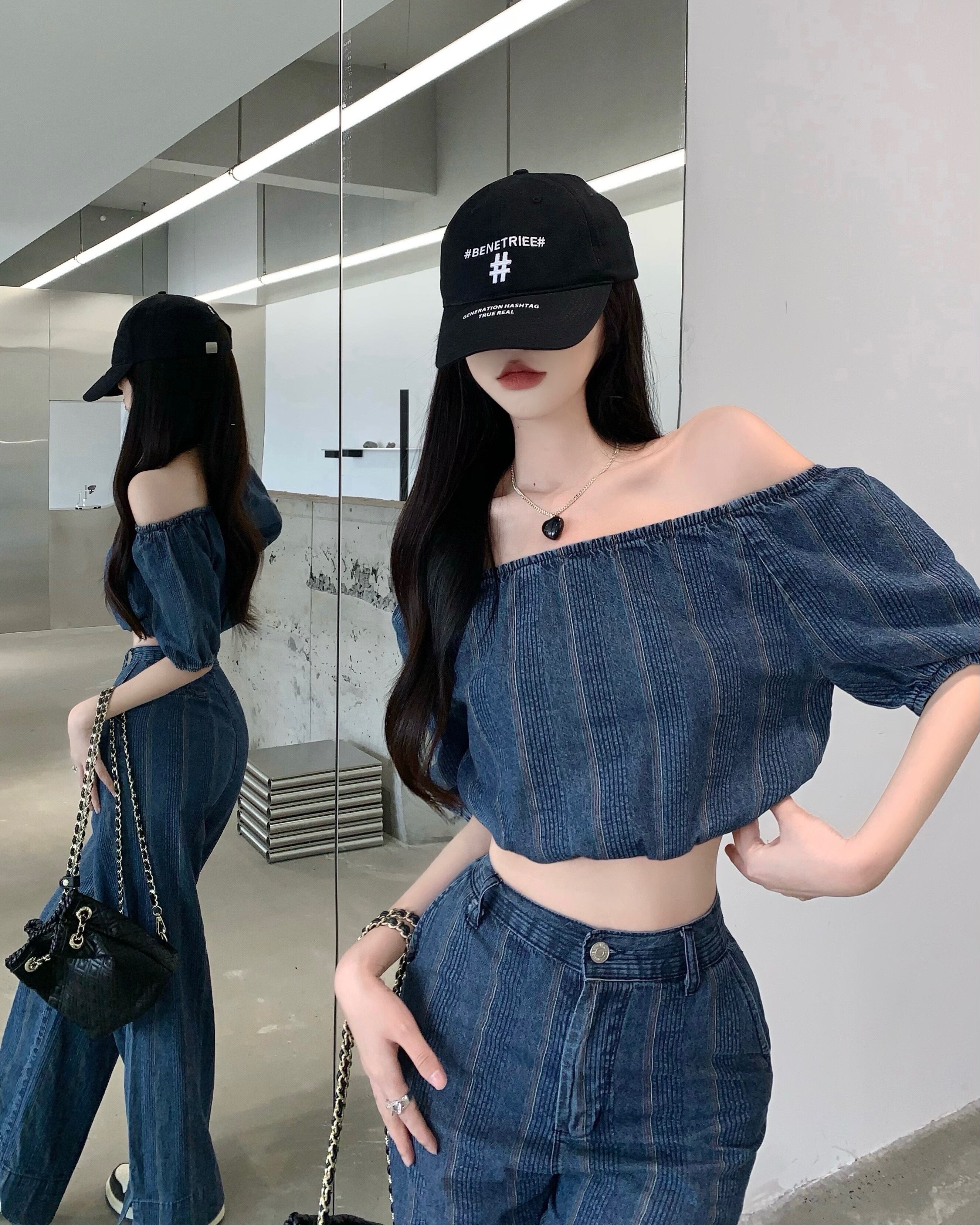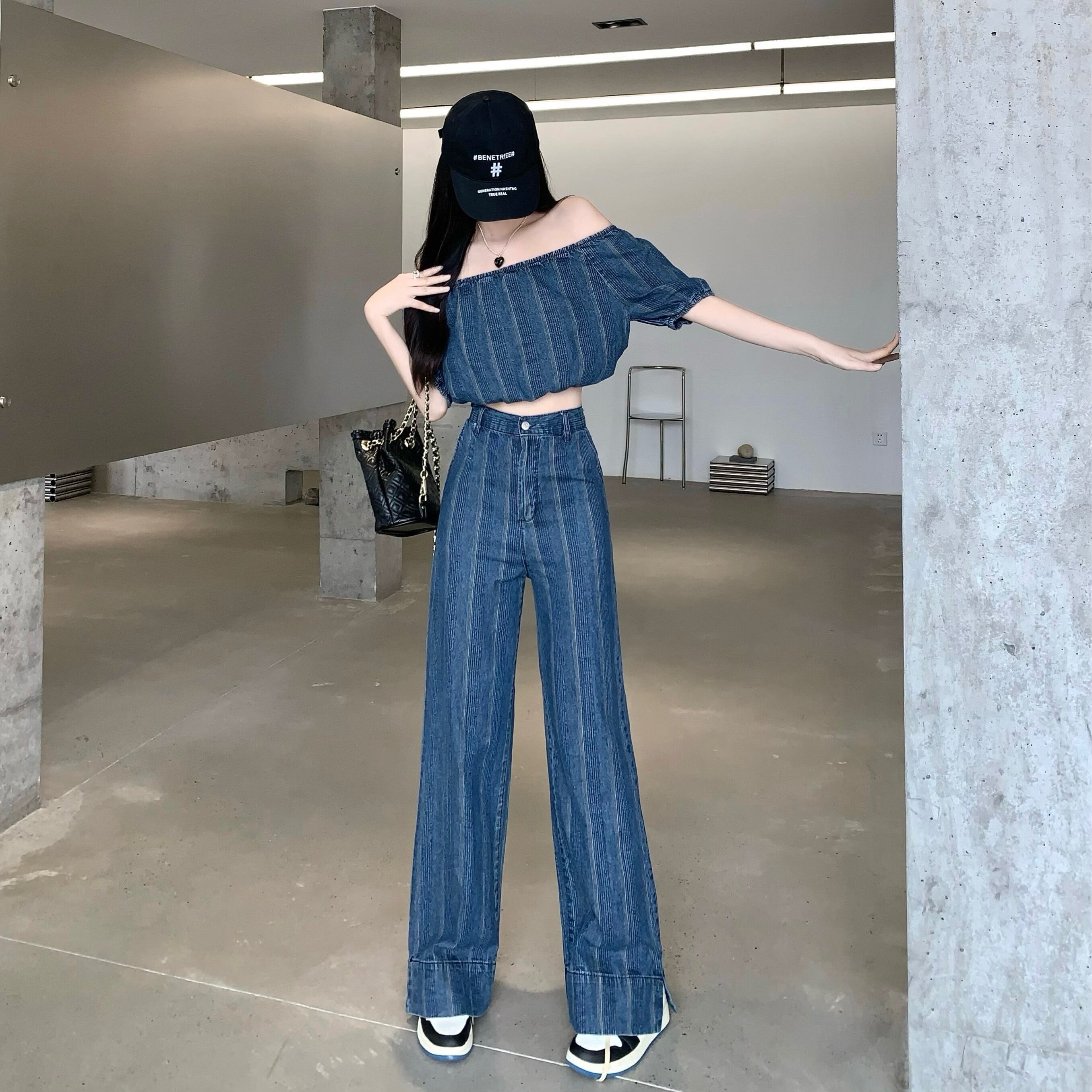 Hong Kong style fashion suit female summer 2022 new short denim shirt wide leg pants high-quality two-piece suit ショート サマー 夏物 ワイドレッグ ワイドパンツ s576194787242369