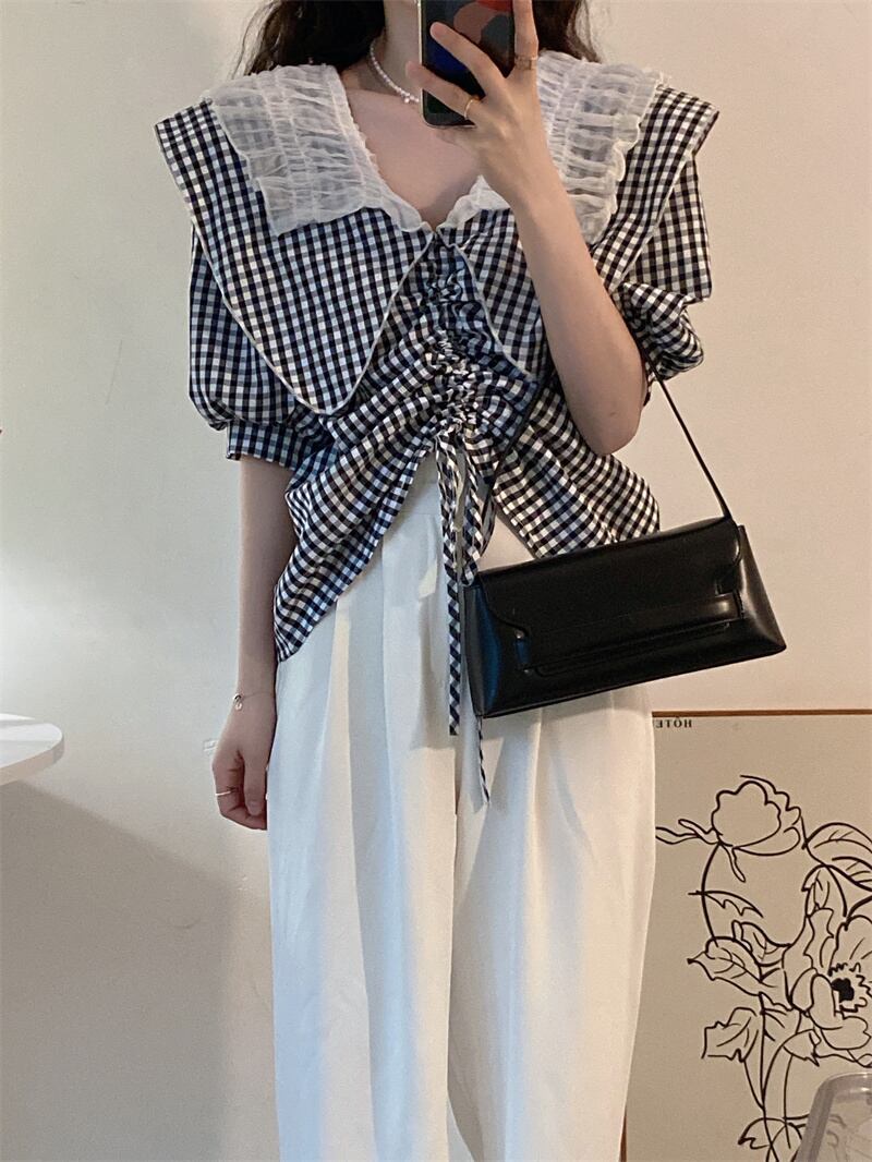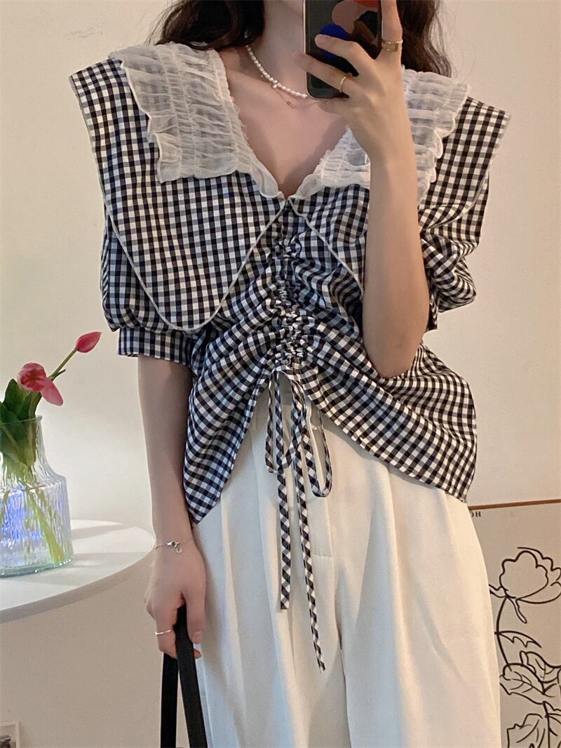 Puff sleeve plaid shirt women's design sense niche summer 2022 new sweet chic doll collar top 大人ガーリー スウィート キュート カジュアル サマー 夏物 s576159134721808