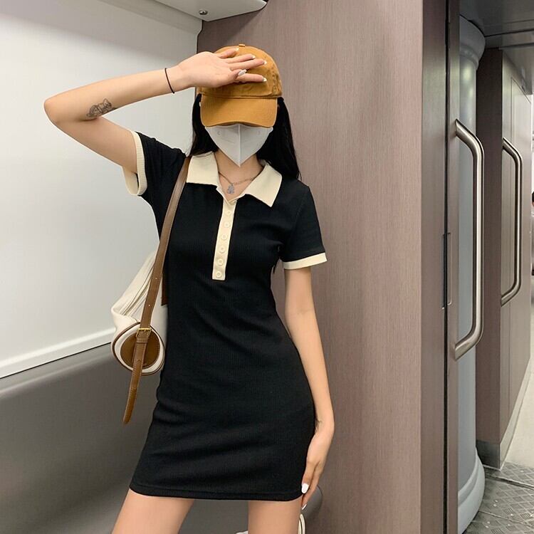Black Polo Collar Dress Women's Summer 2022 Small Temperament Slim Fit Slim Pack Hip Short Skirt ショート ブラック サマー 夏物 スカート スリム s576131460143084