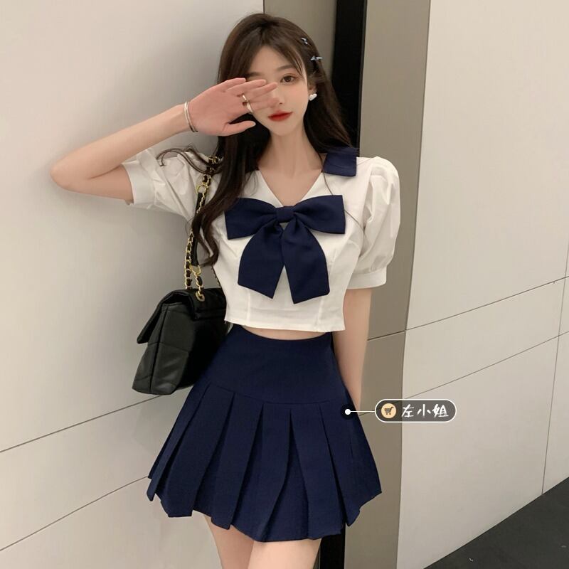 Pure and sweet suit female summer new age-reducing bow top + pleated skirt jk unim two-piece リボン 大人ガーリー スウィート キュート カジュアル プリーツ サマー 夏物 スカート s576144435320643
