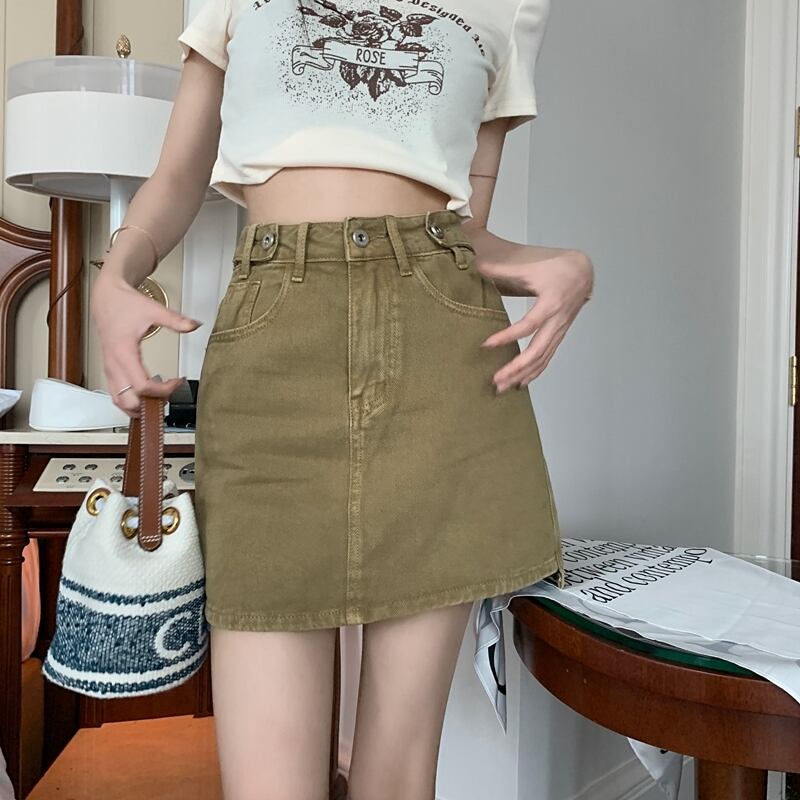Khaki Denim Skirt Women's Summer Small A-Line Skirt 2022 Waist Thin Skirt Short Skirt ショート サマー 夏物 スカート Aライン s576146977027162