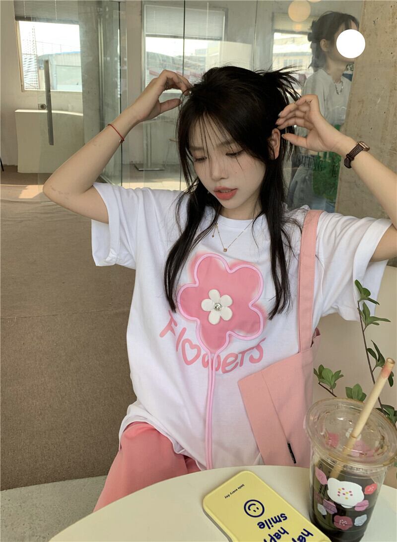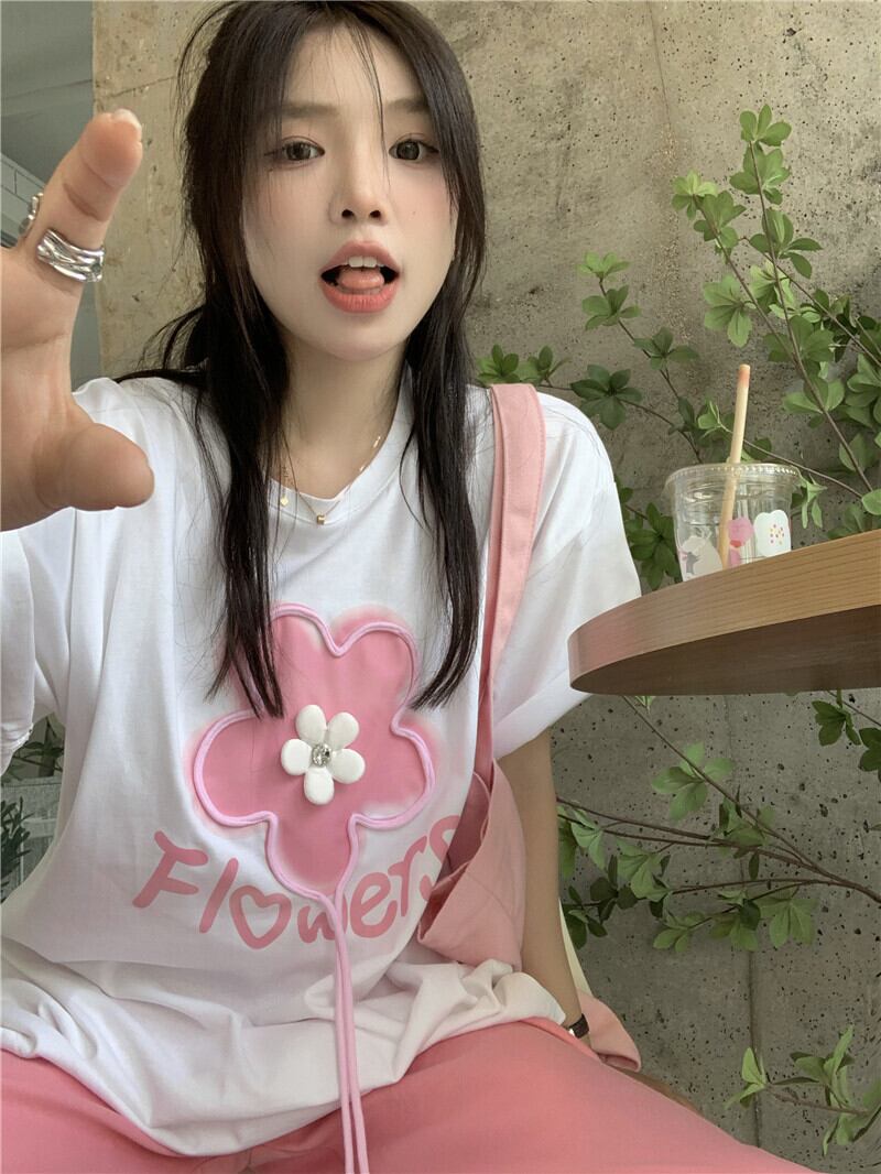 White short-sleeved T-shirt women's design sense niche summer 2022 new sweet three-dimensional flower top ins tide ホワイト 大人ガーリー スウィート キュート カジュアル サマー 夏物 Tシャツ フラワーデザイン s576148666269730