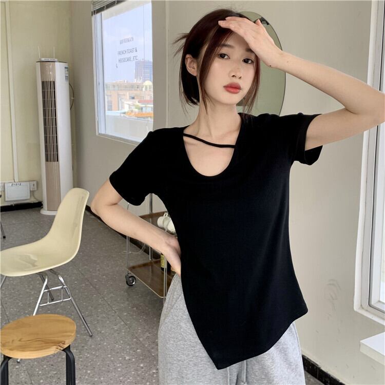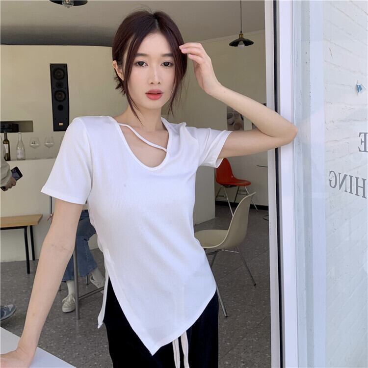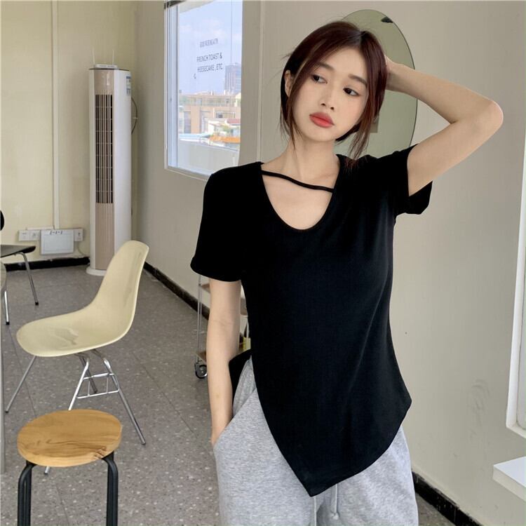 Hot irregular slit top clothes female summer 2022 new design sense niche slim black short-sleeved T-shirt ブラック サマー 夏物 スリム Tシャツ s576139124387112