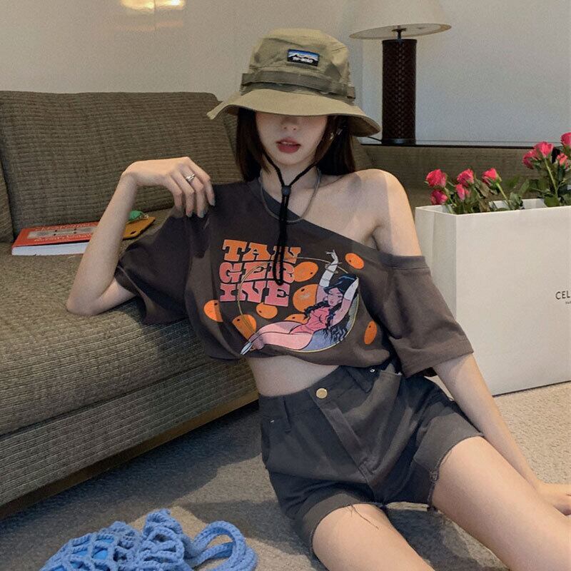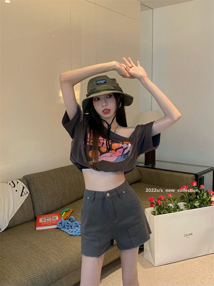 Sweet and cool style short-sleeved T-shirt women's summer 2022 new design small loose shoulder-length short top clothes ショート 大人ガーリー スウィート キュート カジュアル サマー 夏物 Tシャツ s576122228298829