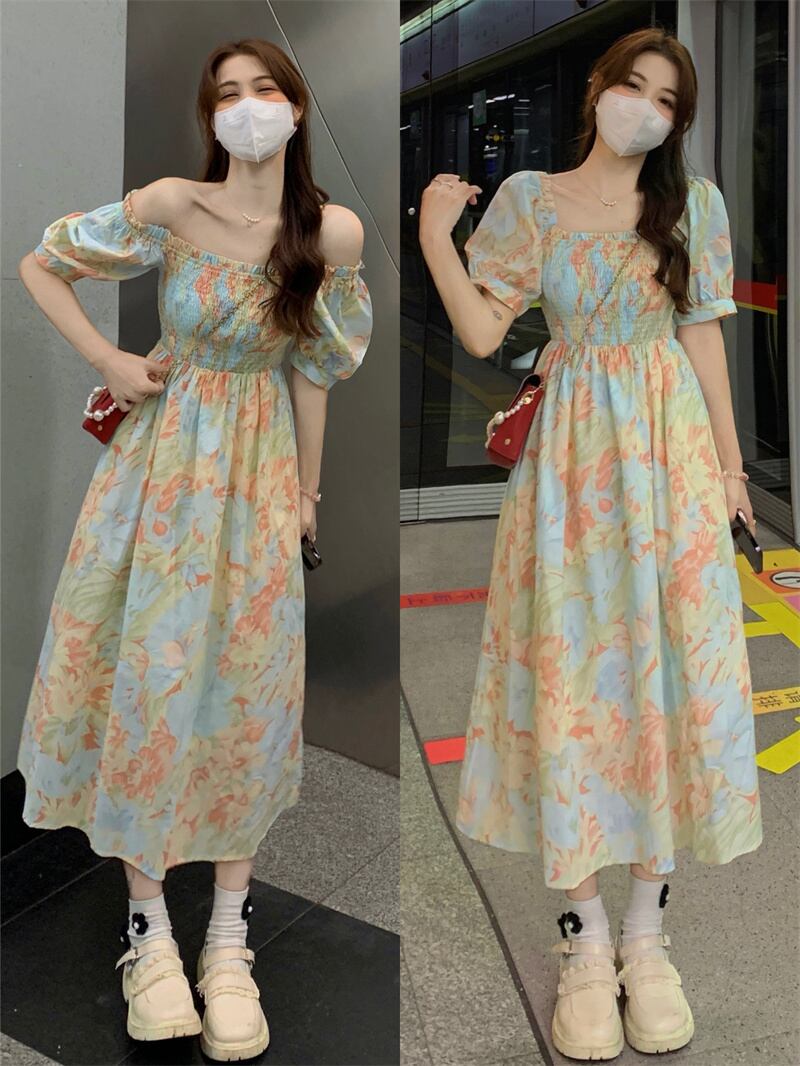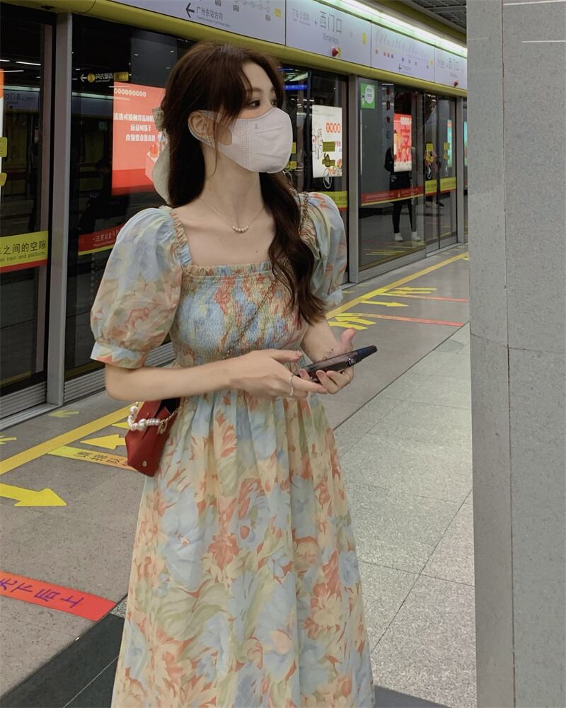 Puff sleeves square neck floral dress women's summer 2022 new high-end temperament goddess fan waist long skirt ロング サマー 夏物 花柄 スカート スクウェア s576196260779646