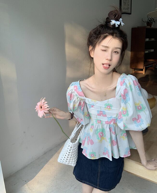 style Western-style age-reducing square-neck top women's summer 2022 new high-end unique special puff sleeve floral shirt サマー 夏物 花柄 スクウェア s576156227314829