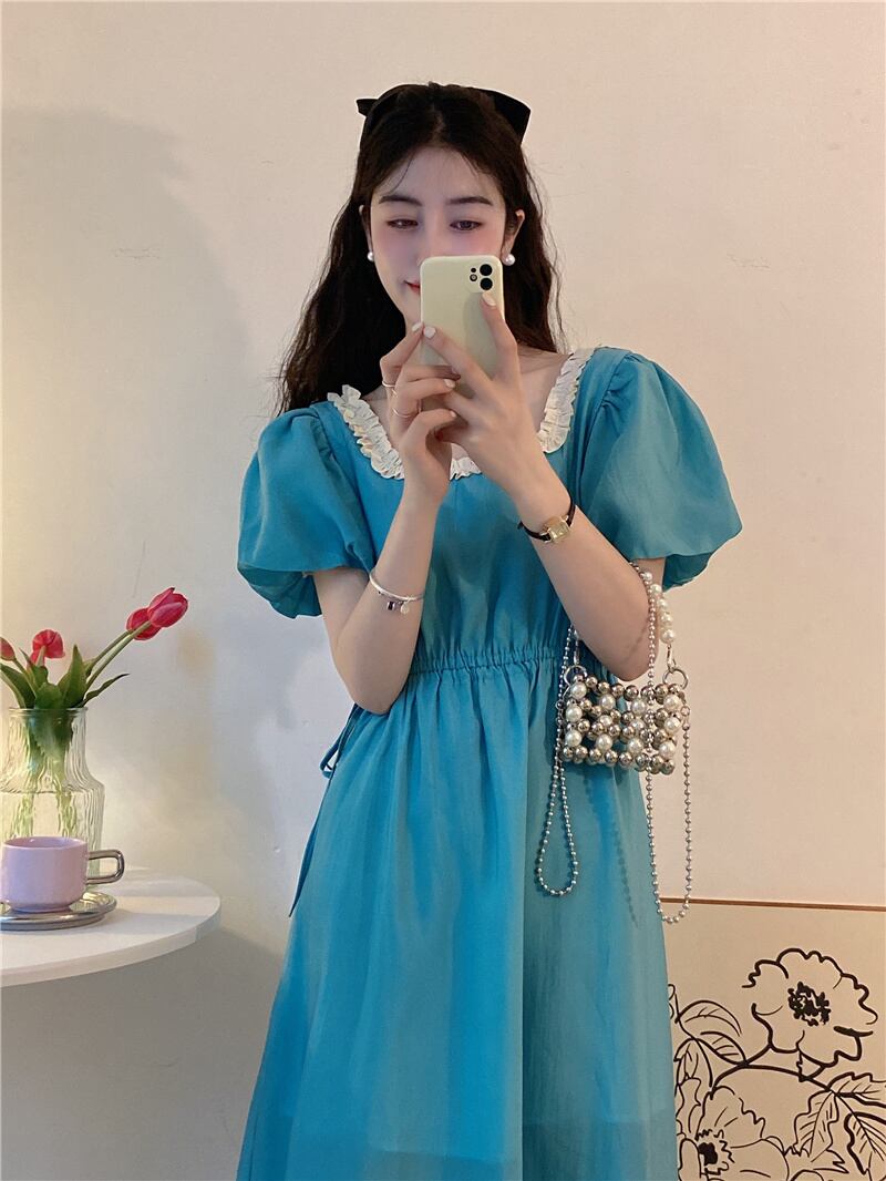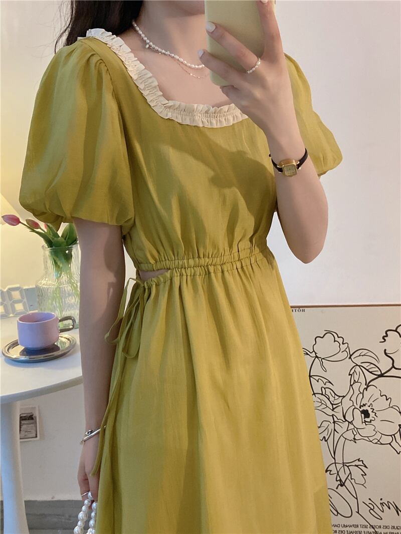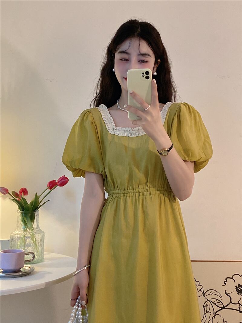 Green waistless dress women's design sense niche summer milk sweet and gentle style puff sleeves square collar long skirt ロング 大人ガーリー スウィート キュート カジュアル サマー 夏物 スカート グリーン スクウェア s576192527025794
