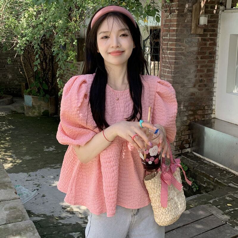 Puff-sleeved short top women's design sense of niche chic and beautiful small shirt summer gentle sweet chiffon shirt ショート シフォン 大人ガーリー スウィート キュート カジュアル サマー 夏物 s576120026382026