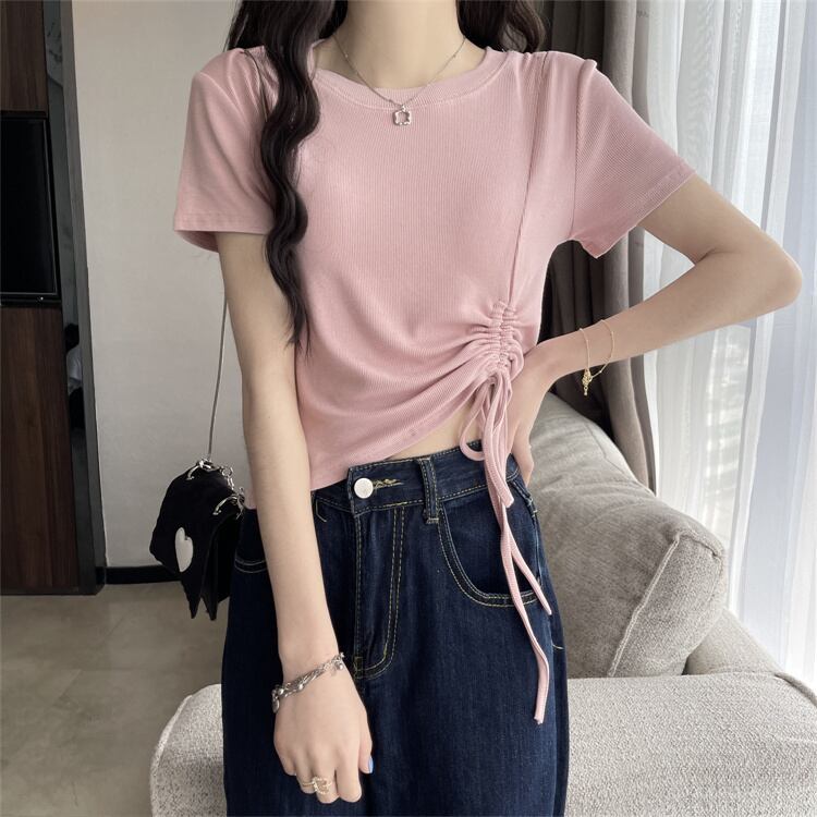 White short-sleeved T-shirt women's clothing design sense niche summer 2022 new slim fit drawstring short top clothes ショート ホワイト サマー 夏物 スリム Tシャツ s576140248700923