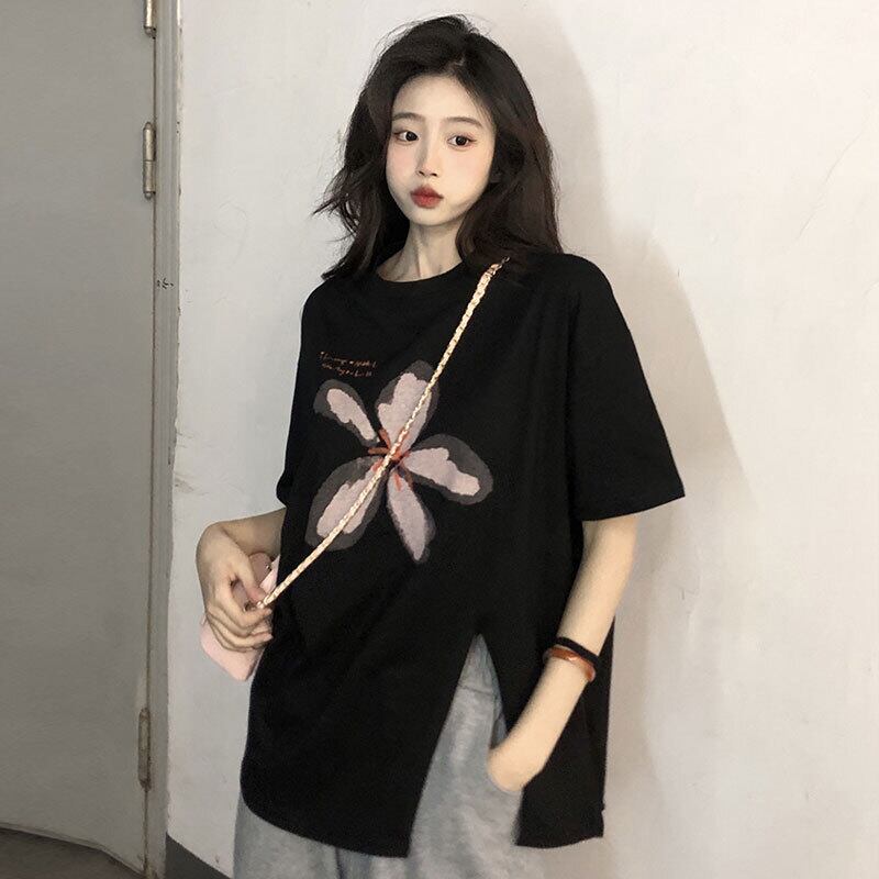 Black cotton short-sleeved T-shirt women's summer 2022 new design sense niche loose slit top clothes ins tide ブラック コットン サマー 夏物 Tシャツ s576184727441744