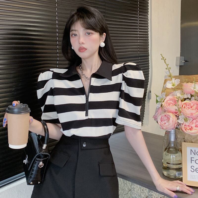 Polo collar short-sleeved T-shirt women's summer design sense niche 2022 new chic Hong Kong-flavored striped top clothes ins tide レッド サマー 夏物 ストライプ Tシャツ s576123272932045