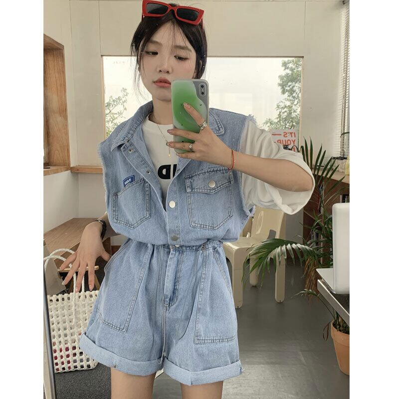 Tooling denim one-piece shorts women's summer chic Hong Kong-style high-end jumpsuit small loose wide-leg pants サマー 夏物 ショーツ ブルマー s576173601780825