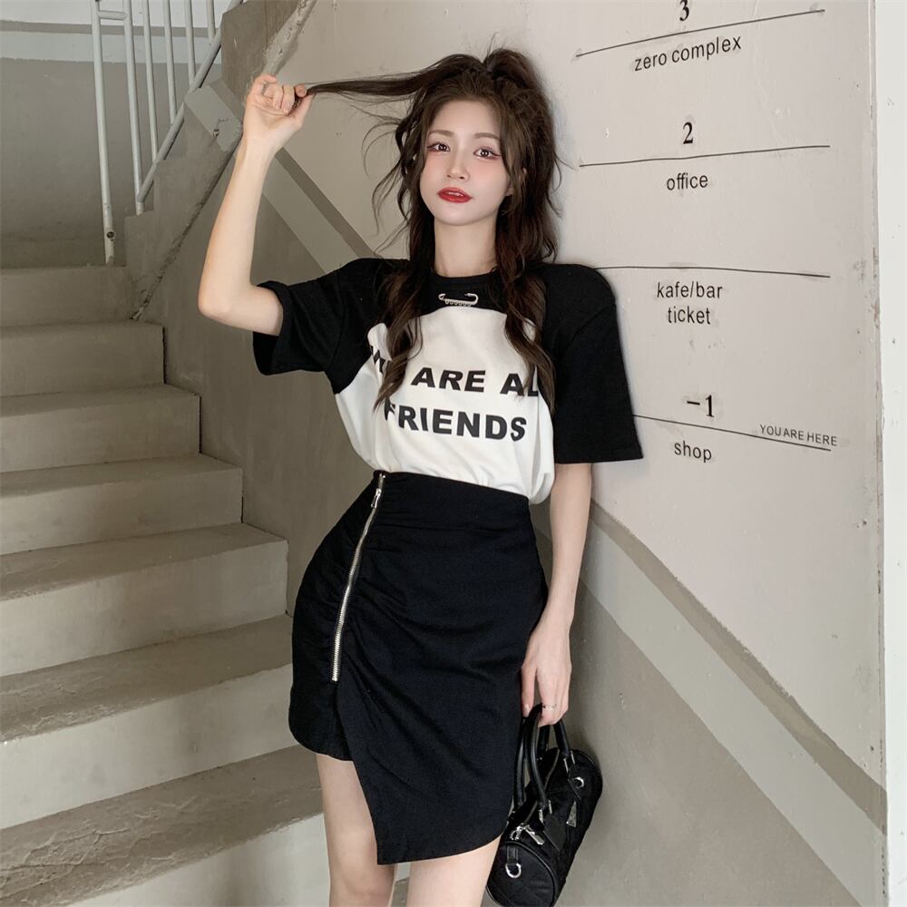 色:ブラック/ホワイトstitchingT-shirt,ブラックスカート