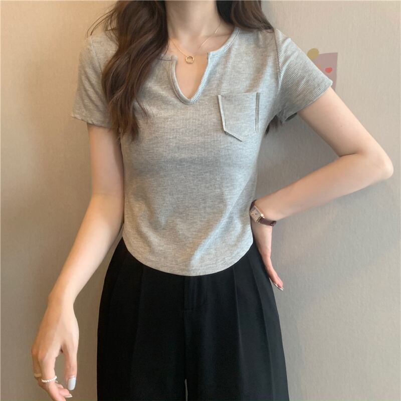 Grey short-sleeved T-shirt women's summer design sense niche 2022 new slim fit and thin short top clothes ins trend ショート サマー 夏物 スリム Tシャツ s576137122630803