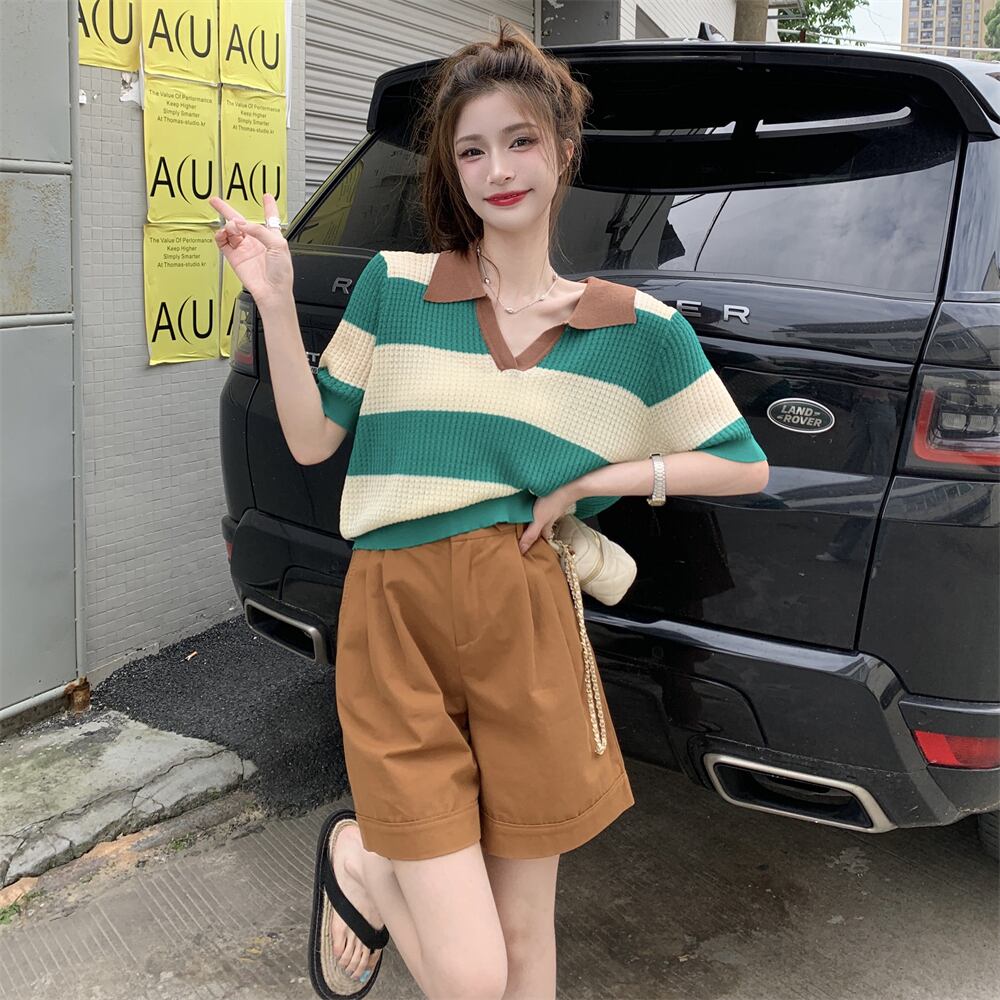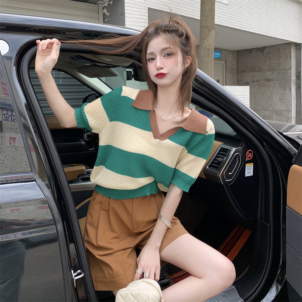 Front-shoulder short-sleeved T-shirt women's design sense niche summer thin section chic Hong Kong flavor loose striped knitted top ins tide サマー 夏物 ストライプ Tシャツ s576170967027954
