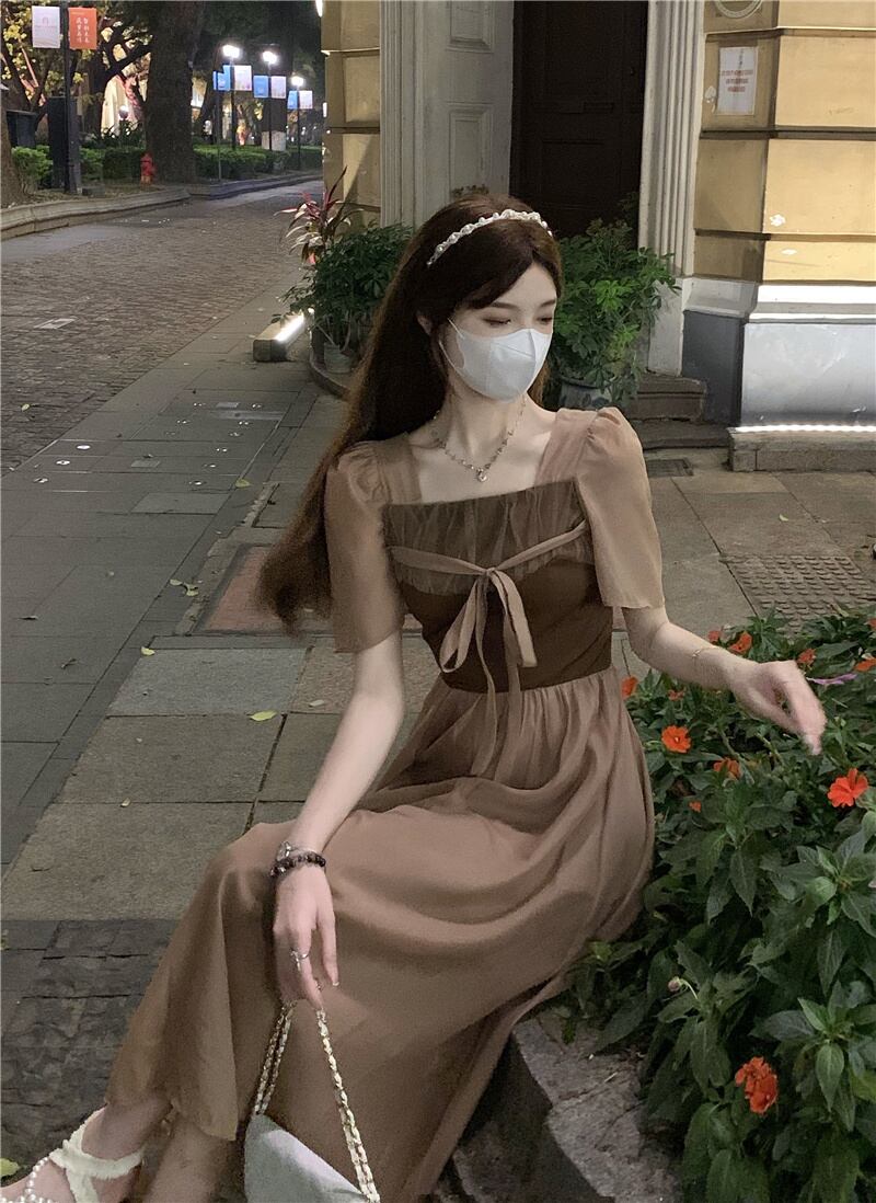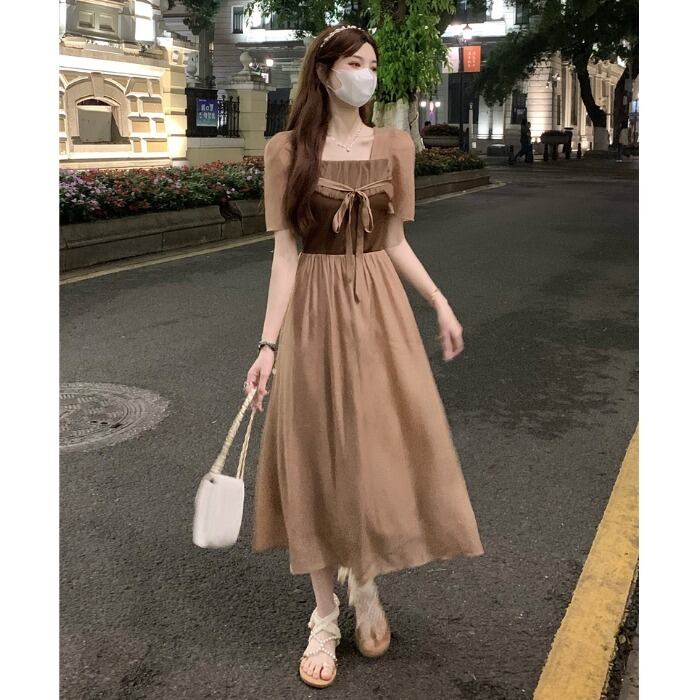 Bow knot square neck dress female summer 2022 new French retro high-quality temperament milk sweet long skirt ロング レトロ 大人ガーリー スウィート キュート カジュアル サマー 夏物 スカート スクウェア s576198107898104