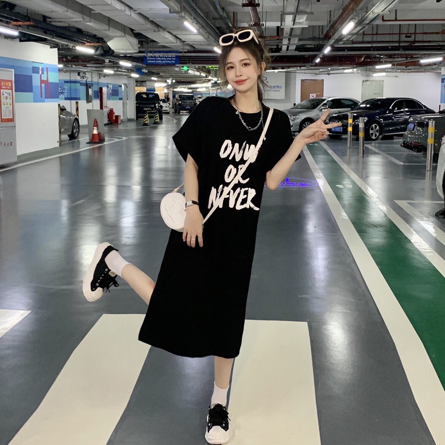 Black T-shirt dress women's summer 2022 new American retro Hong Kong flavor chic loose casual long skirt ロング ブラック レトロ カジュアル サマー 夏物 スカート Tシャツ s576180531159801