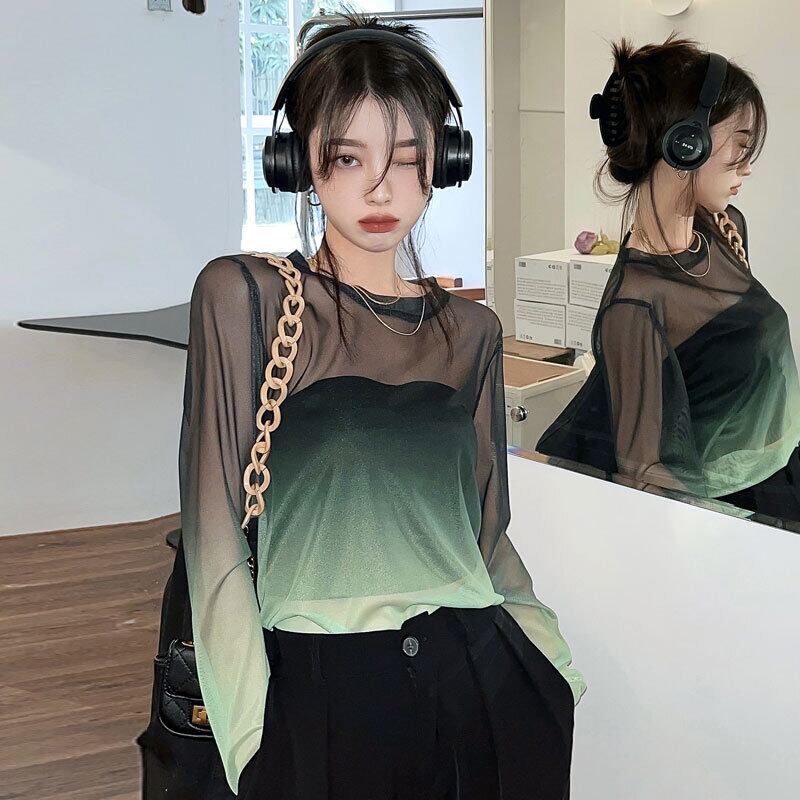 Gradient color sunscreen blouse women's summer thin long-sleeved T-shirt design niche loose transparent top ロング ブラウス サマー 夏物 Tシャツ s576153837869919