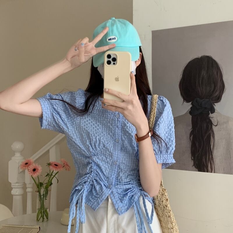 French temperament gentle wind square collar top women's summer design sense niche unique shirt blue puff sleeve shirt ブルー サマー 夏物 スクウェア s57615795961777