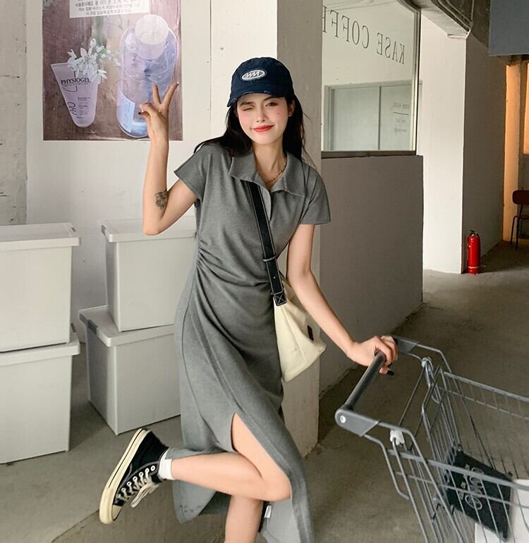 Gray T-shirt dress women's summer design sense niche 2022 new Hong Kong flavor retro chic slit long skirt ロング レトロ サマー 夏物 スカート Tシャツ s576167213773089