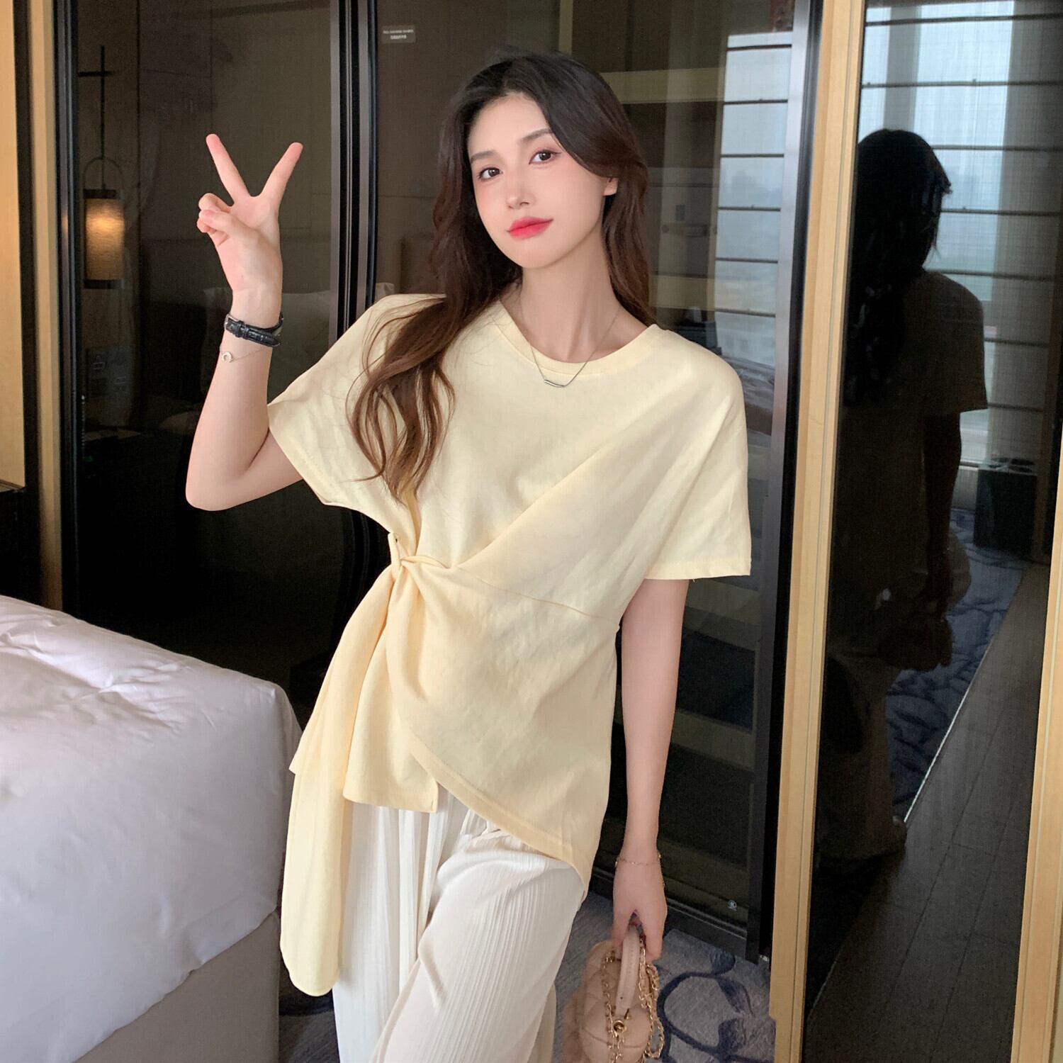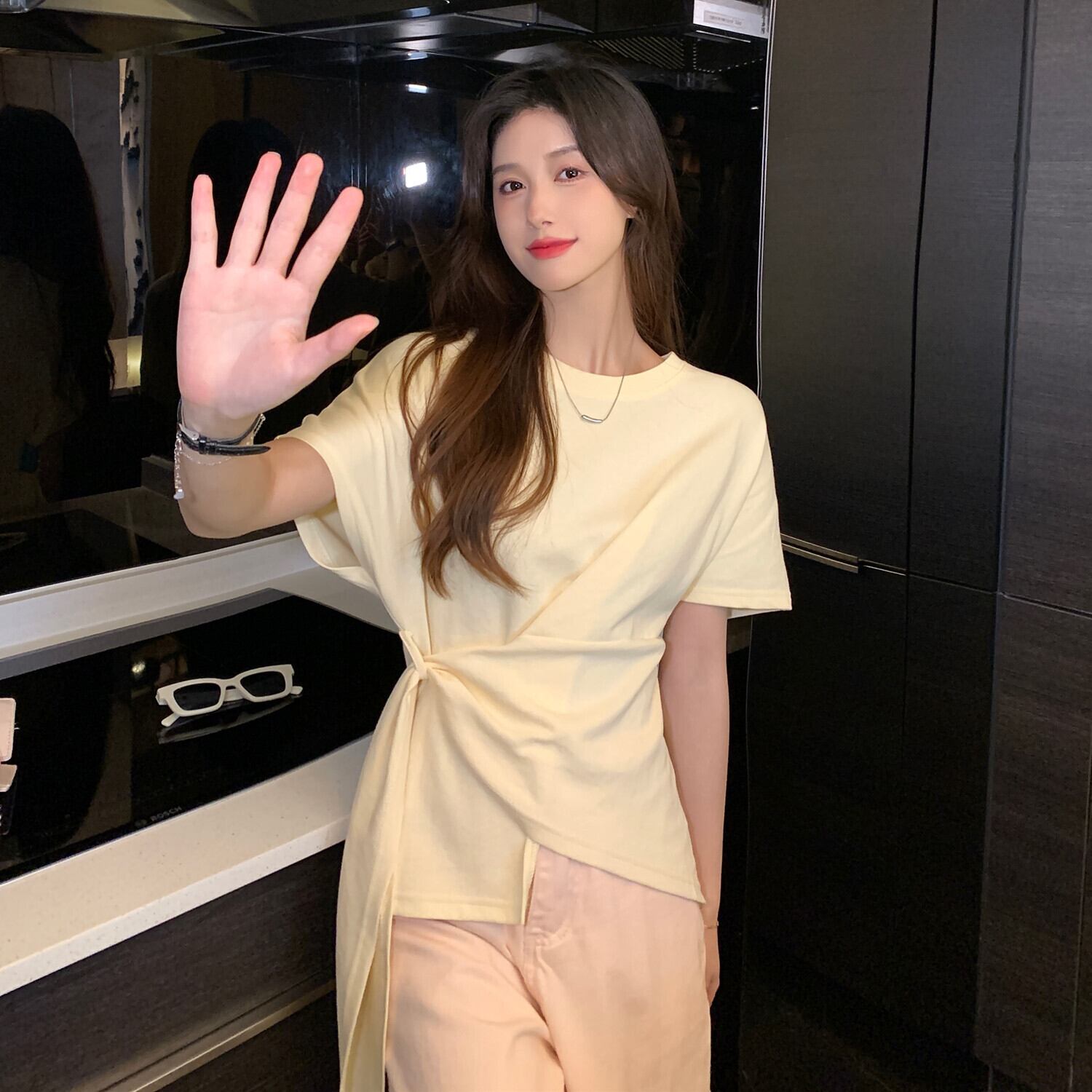 Peach pink short-sleeved T-shirt women's design sense niche summer 2022 new irregular chic unique cotton top ピンク コットン サマー 夏物 Tシャツ s576154151997247