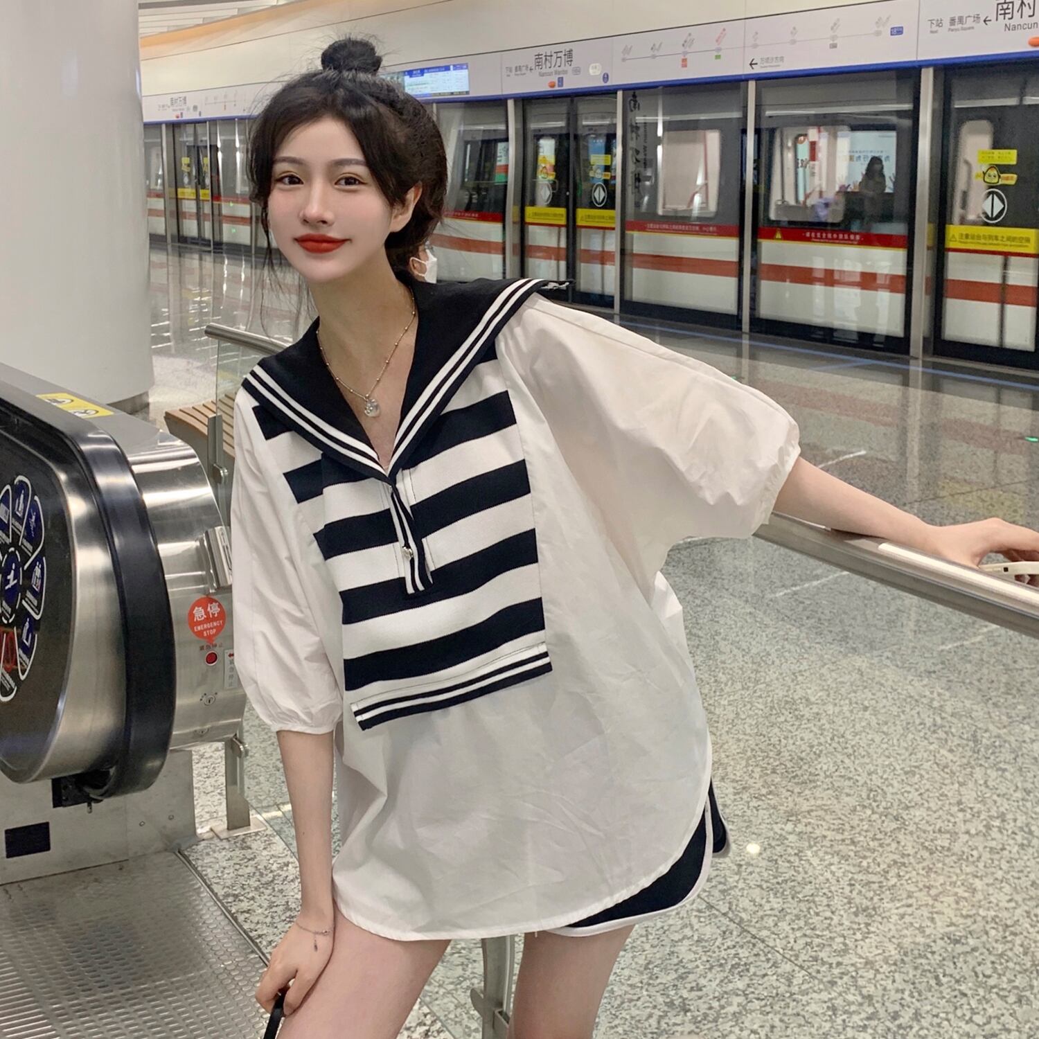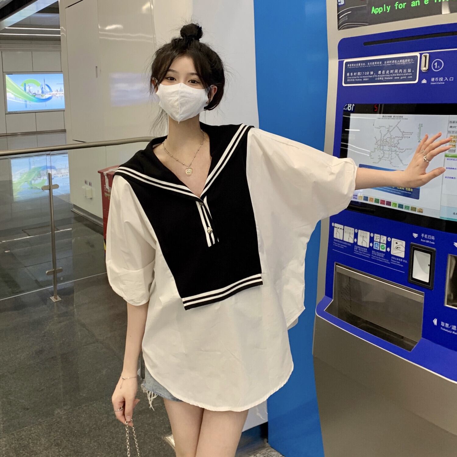 style short-sleeved shirt women's design sense niche summer 2022 new chic chic navy collar top サマー 夏物 s57614934311066