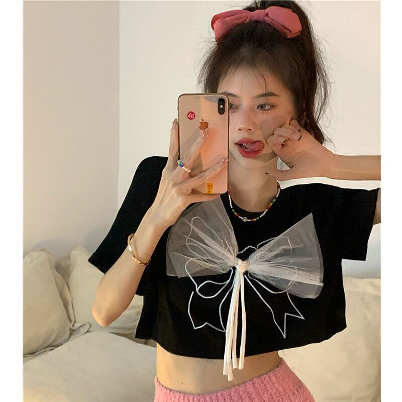 Hot bow short top clothes female summer design niche 2022 new chic black short-sleeved T-shirt ショート ブラック リボン サマー 夏物 Tシャツ s576172409777312