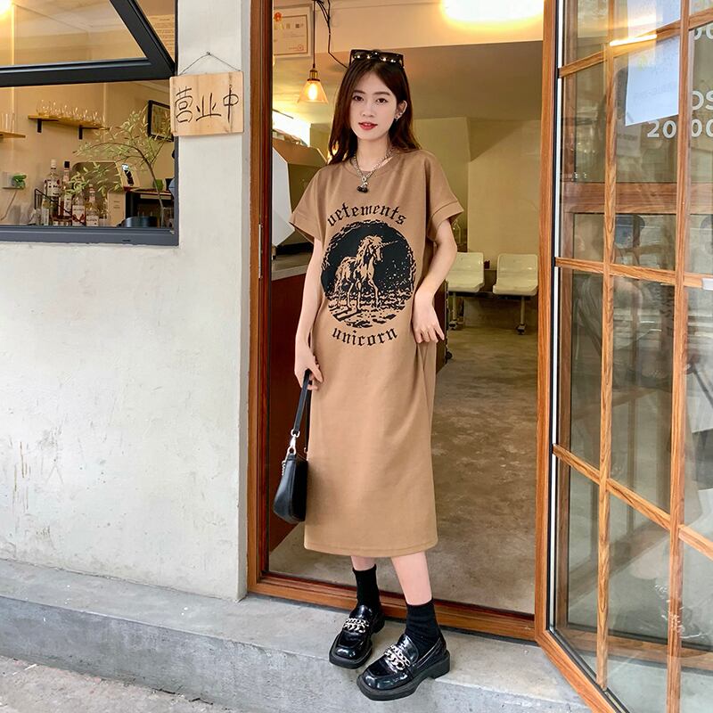 Coffee color T-shirt dress women's summer 2022 new Hong Kong flavor retro chic loose split casual long skirt ロング レトロ カジュアル サマー 夏物 スカート Tシャツ s576170741845593