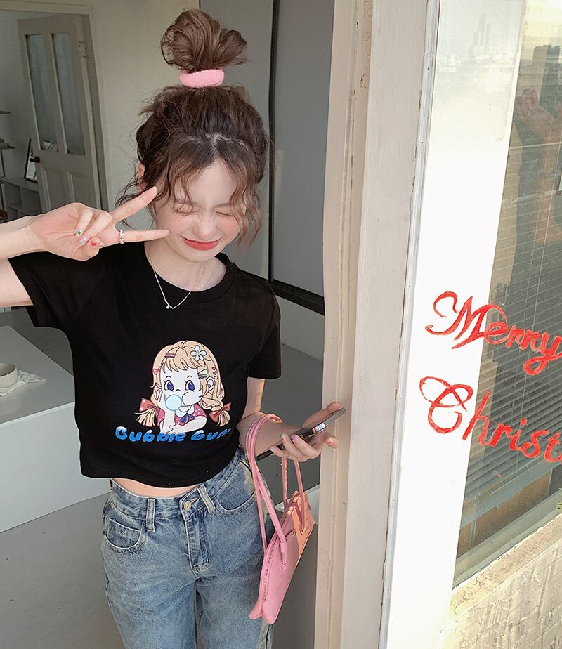 Sweet Spice Girl White Cartoon Short Sleeve T-Shirt Women's Summer 2022 Slim Slim Short Top Clothes ショート ホワイト 半袖 ハーフスリーブ 大人ガーリー スウィート キュート カジュアル サマー 夏物 スリム Tシャツ s576114454233887