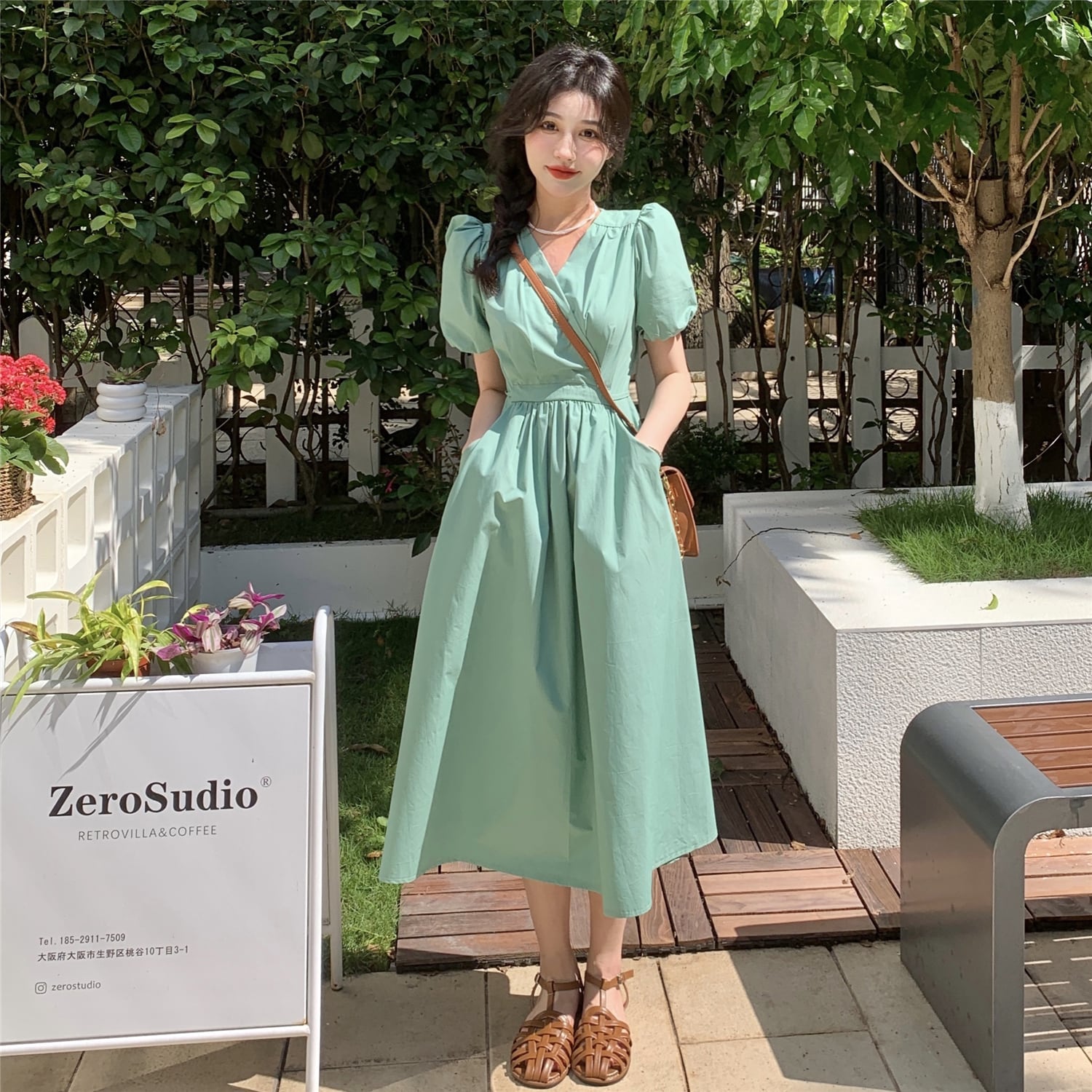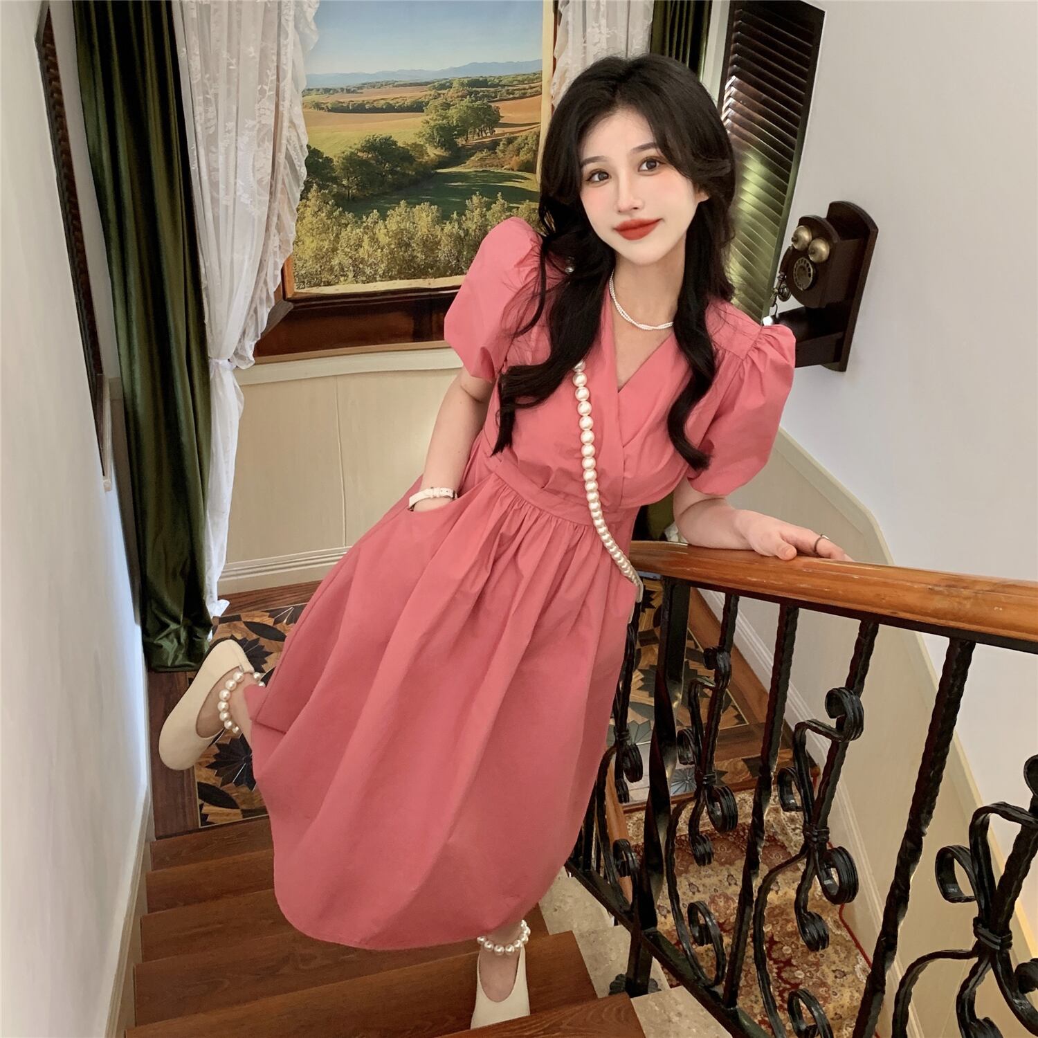 Rose red V-neck dress female summer 2022 new style high-end gentle wind first love puff sleeve long skirt ロング レッド サマー 夏物 スカート Vネック s576170218790413