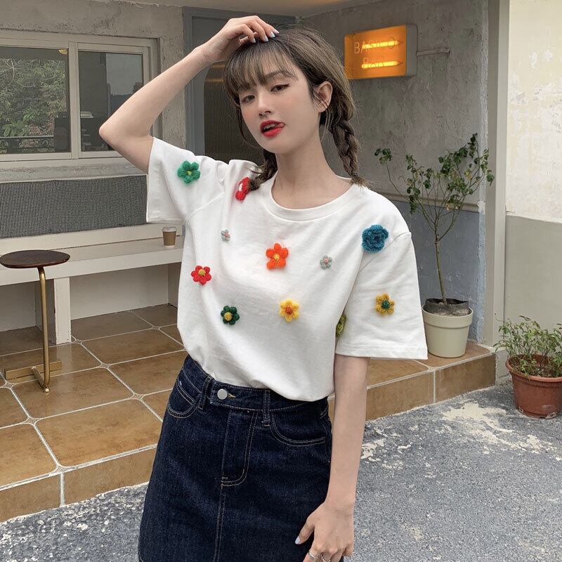 White short-sleeved T-shirt women's summer design sense niche 2022 new sweet three-dimensional flower top clothes ホワイト 大人ガーリー スウィート キュート カジュアル サマー 夏物 Tシャツ フラワーデザイン s576148261282586