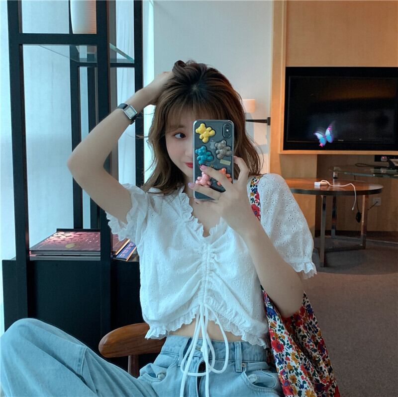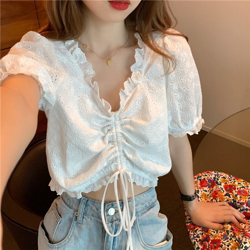 Pure Desire Hot Girl Small V-Neck Short Top Women's Summer Chic Shirt White Puff Sleeve Shirt ショート ホワイト サマー 夏物 Vネック s576154809340412