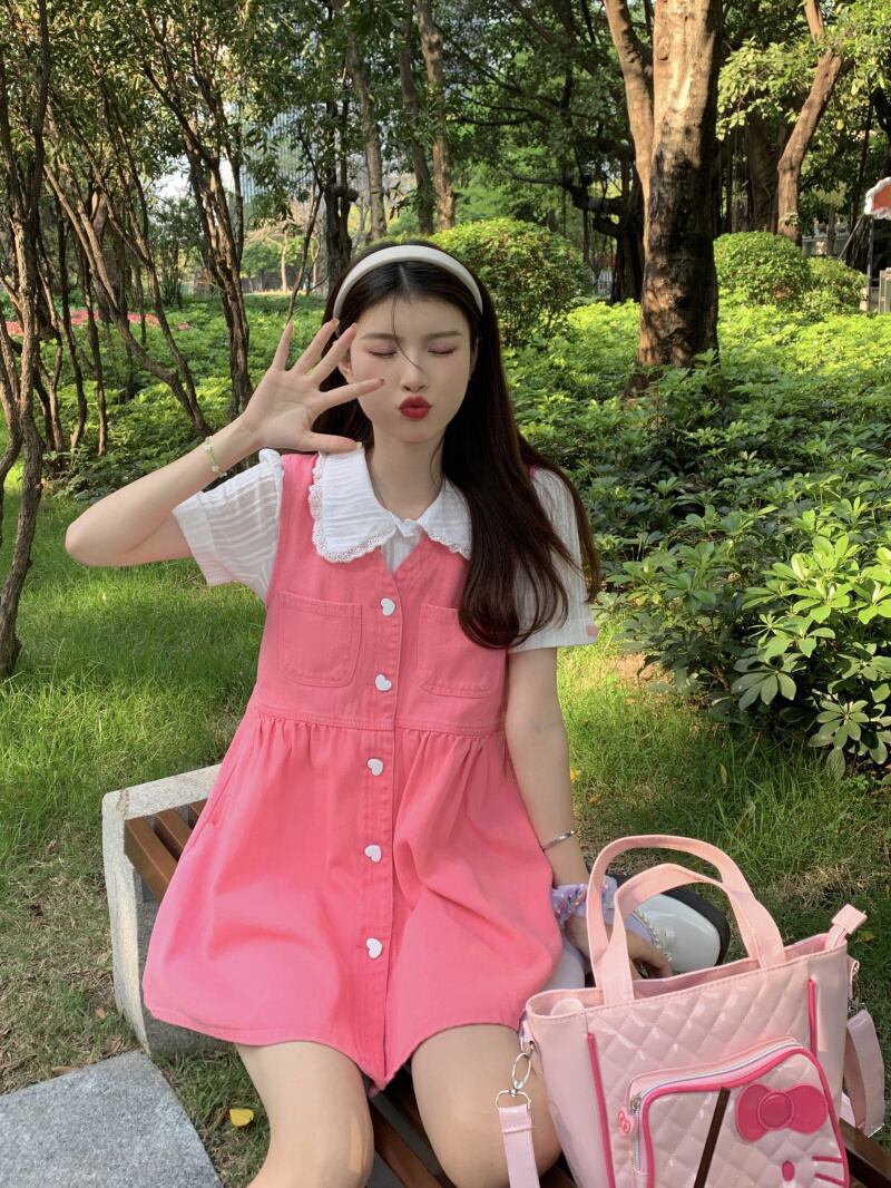 Pink denim vest dress women's summer 2022 new style small eign style age-reducing sweet milk short skirt ショート ピンク 大人ガーリー スウィート キュート カジュアル サマー 夏物 スカート s576164319033894