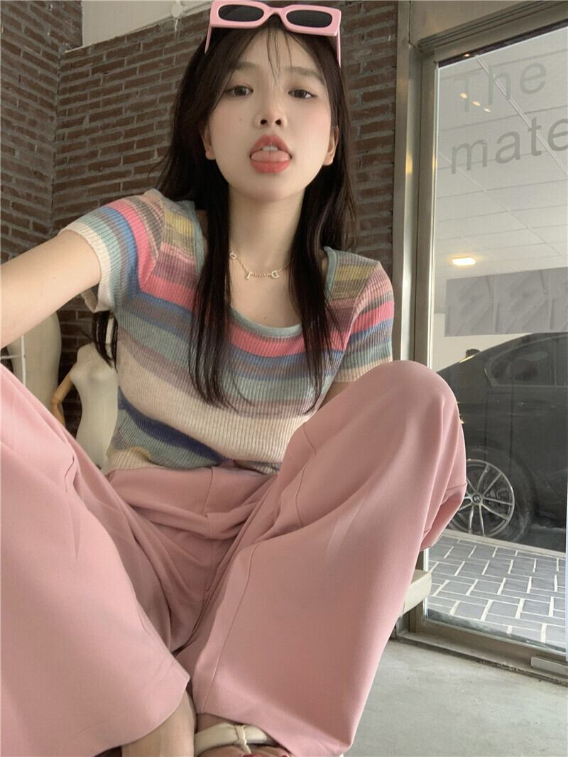 Sweet Spice Girl Rainbow Striped Knitted Short Sleeve T-Shirt Women's Summer 2022 Sense of Small Short Top Clothes ショート 半袖 ハーフスリーブ 大人ガーリー スウィート キュート カジュアル サマー 夏物 ストライプ Tシャツ s576183250484119