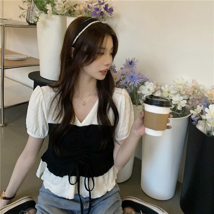 Top summer women's 2022 new design sense drawstring V-neck short-sleeved shirt contrast color stitching fake two-piece shirt サマー 夏物 Vネック ステッチ s576179366268404