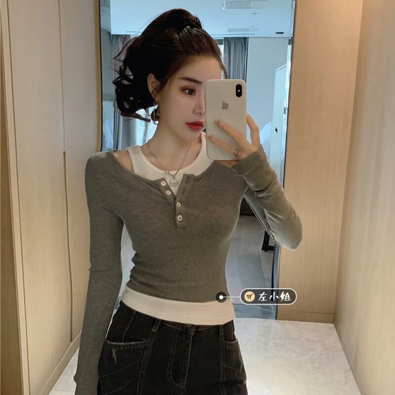sense all-match slim short fake two-piece bottoming shirt long-sleeved T-shirt women's spring and autumn 2022 short top ショート ロング スプリング 春物 オータム 秋物 スリム Tシャツ s576175146145956