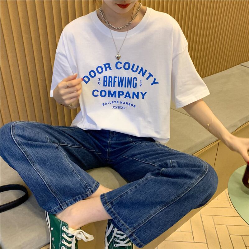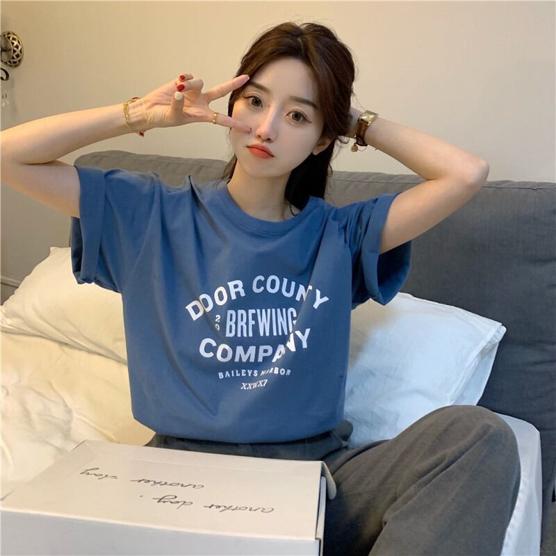 Blue letter short-sleeved T-shirt women's summer 2022 new design sense of niche loose lazy wind casual clothes ブルー カジュアル サマー 夏物 Tシャツ s5761471237539