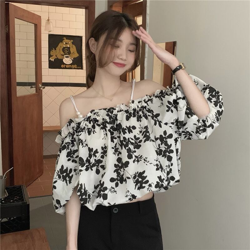 Hot one-shoulder short top women's summer design niche chic shirt French puff sleeve floral shirt ショート サマー 夏物 花柄 s576129260581769