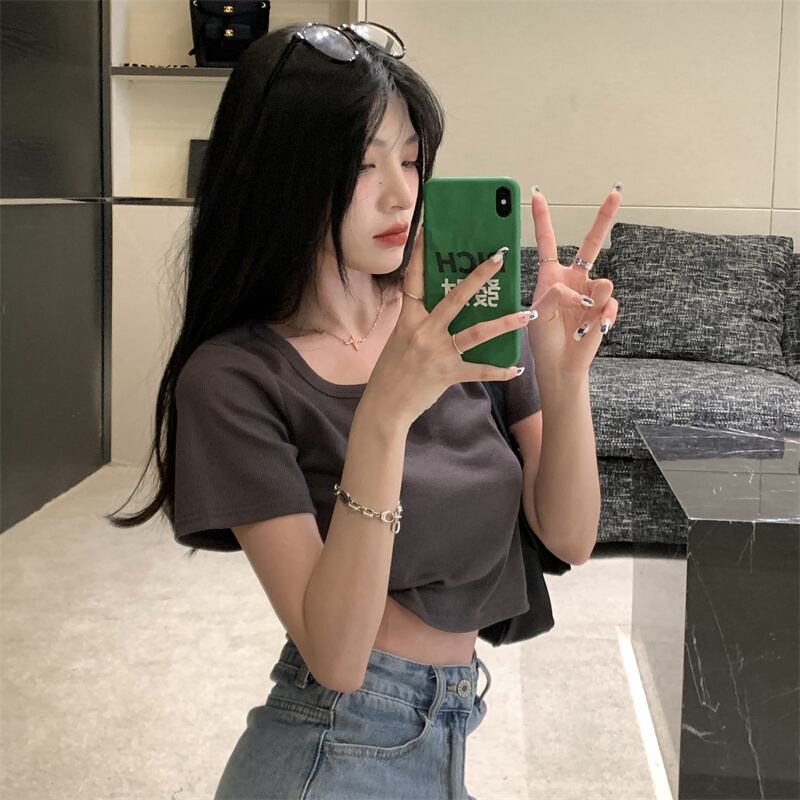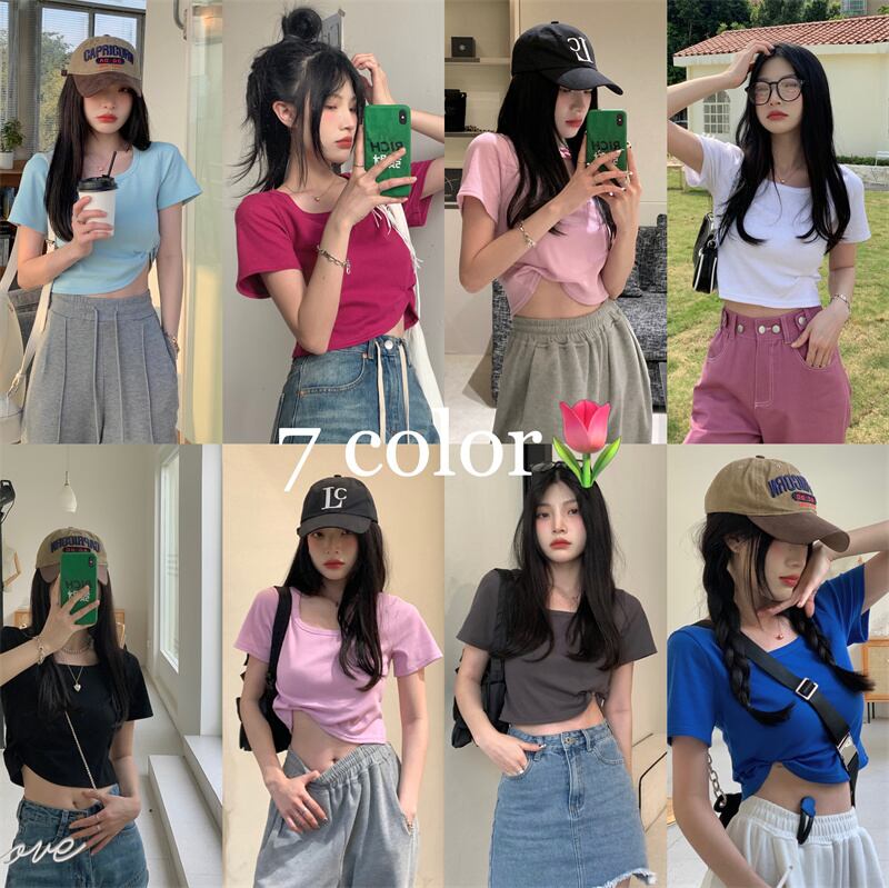 Sweet Spice Girl Cotton Short Sleeve T-Shirt Women's Sensation Niche Summer Pure Desire Chic Slim Front Shoulder Short Top ins ショート コットン 半袖 ハーフスリーブ 大人ガーリー スウィート キュート カジュアル サマー 夏物 スリム Tシャツ ピュア s576194046573078