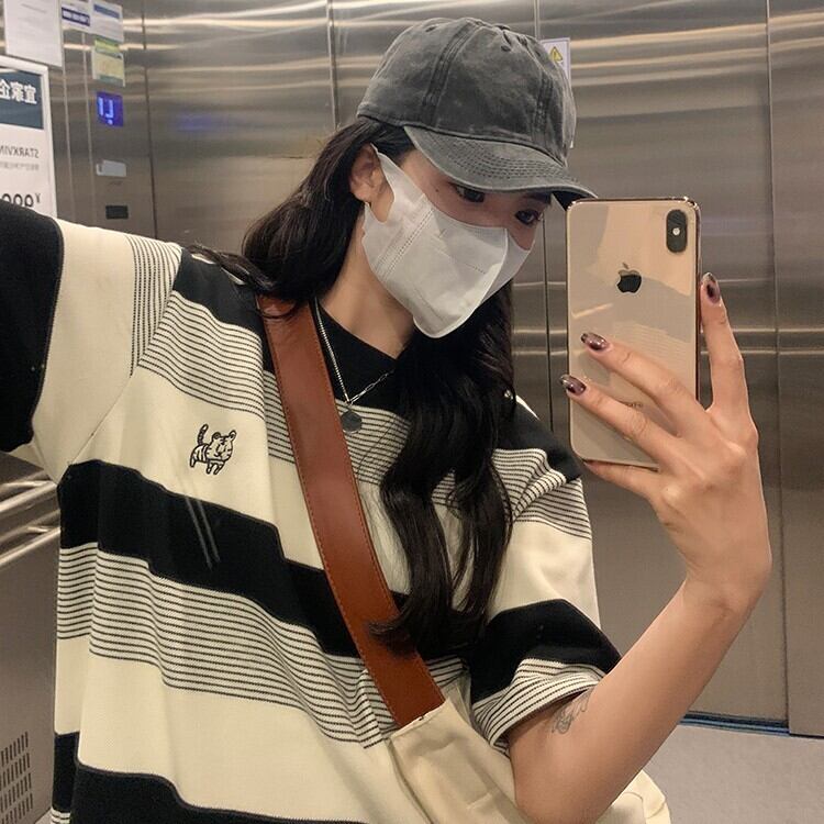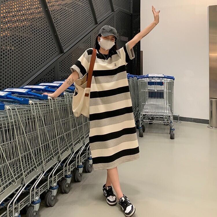 Striped T-shirt dress women's design sense niche summer Hong Kong flavor retro chic loose split casual long skirt ロング レトロ カジュアル サマー 夏物 スカート ストライプ Tシャツ s576178336773531
