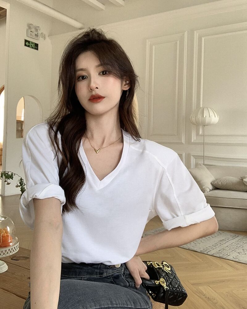 Cotton short-sleeved T-shirt women's summer design niche 2022 new version loose shoulder pad white V-neck clothes ホワイト コットン サマー 夏物 Vネック Tシャツ s576122635372259