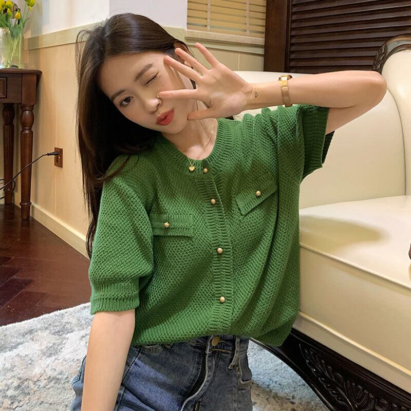 Xiaoxiangfeng short-sleeved knitted sweater women's summer 2022 new French gentle and chic high-end green short top ショート サマー 夏物 グリーン s576173470758326