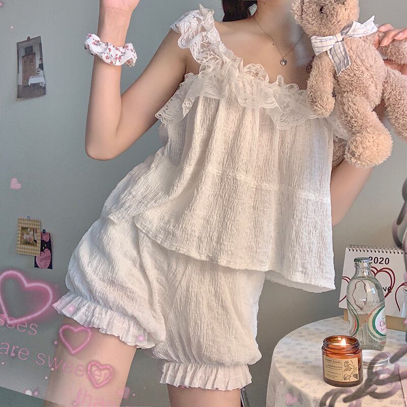 Lace suspenders pajamas female summer net red cute 2022 new sweet princess style high-end home wear suit レッド レース 大人ガーリー スウィート キュート カジュアル サマー 夏物 s576154172573674