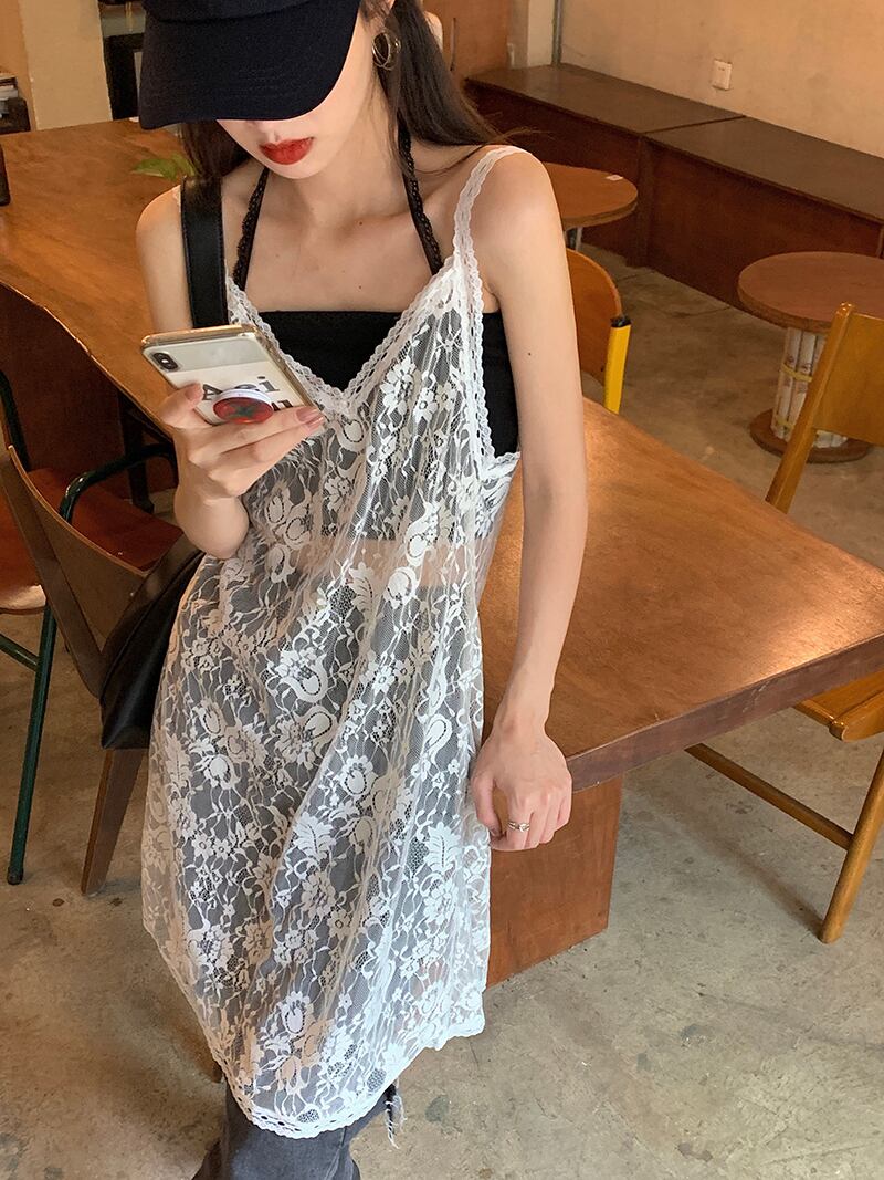 Hot lace suspender dress female summer 2022 new design niche sexy chic hollow long skirt ロング レース サマー 夏物 スカート s576172155617078