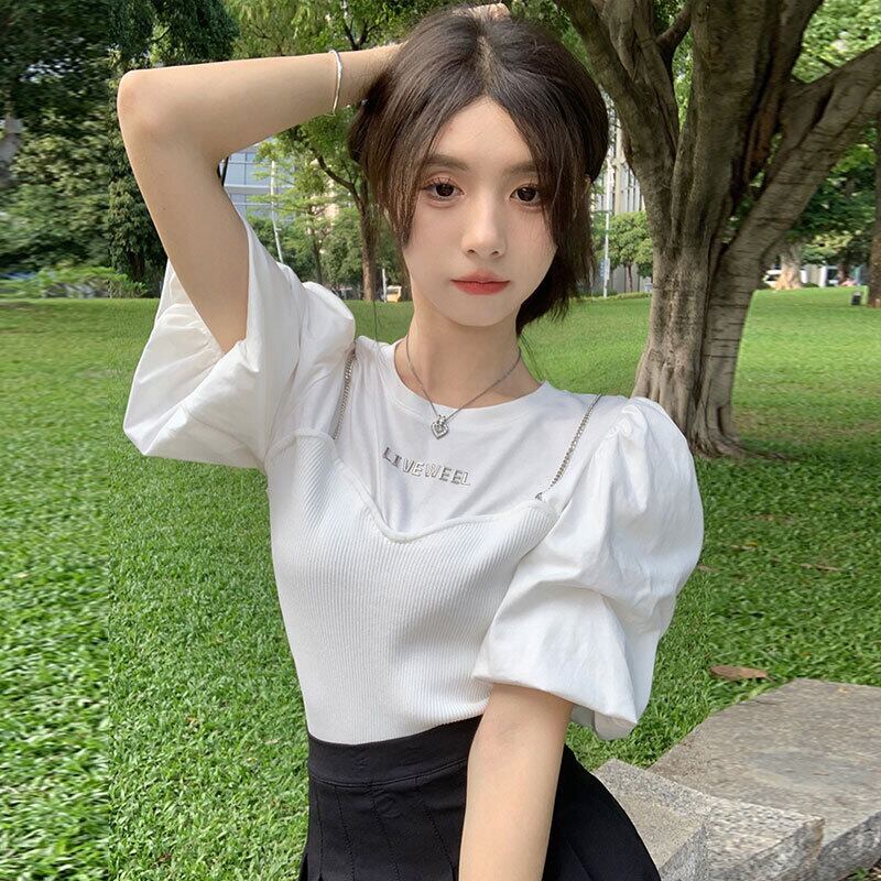 Fake two-piece short-sleeved T-shirt women's design sense niche summer style gentle and unique puff sleeve short top ショート サマー 夏物 Tシャツ s576113489907840