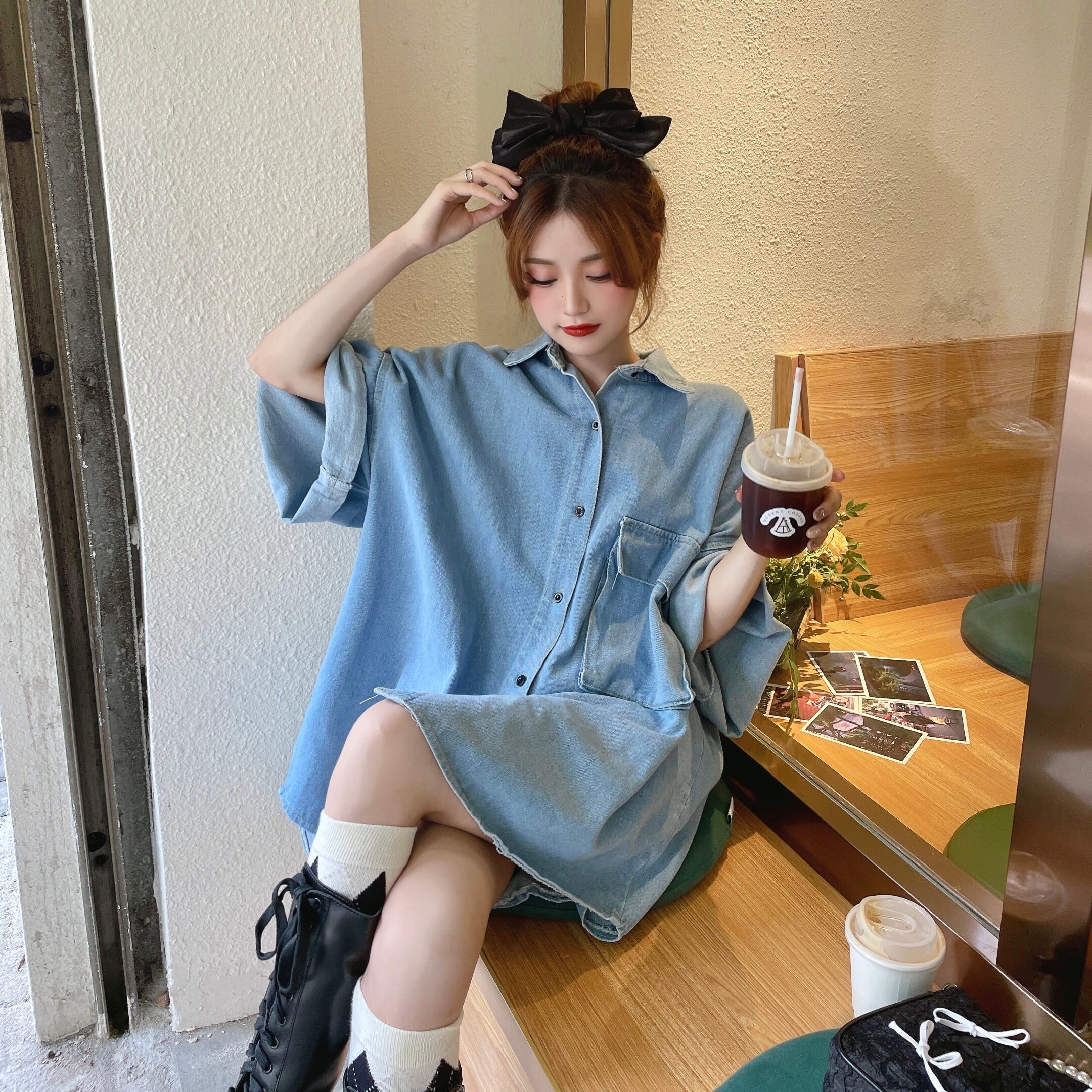 Denim shirt jacket women's design sense niche shirt 2022 new summer chic Hong Kong flavor high-end short-sleeved top サマー 夏物 s576124979083355