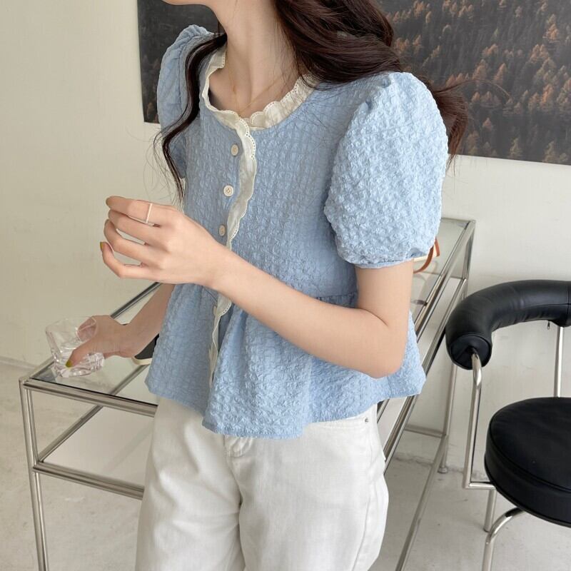 Small fresh and sweet top women's design sense niche summer gentle chic chic blue puff sleeve shirt ブルー 大人ガーリー スウィート キュート カジュアル サマー 夏物 s576125653313970