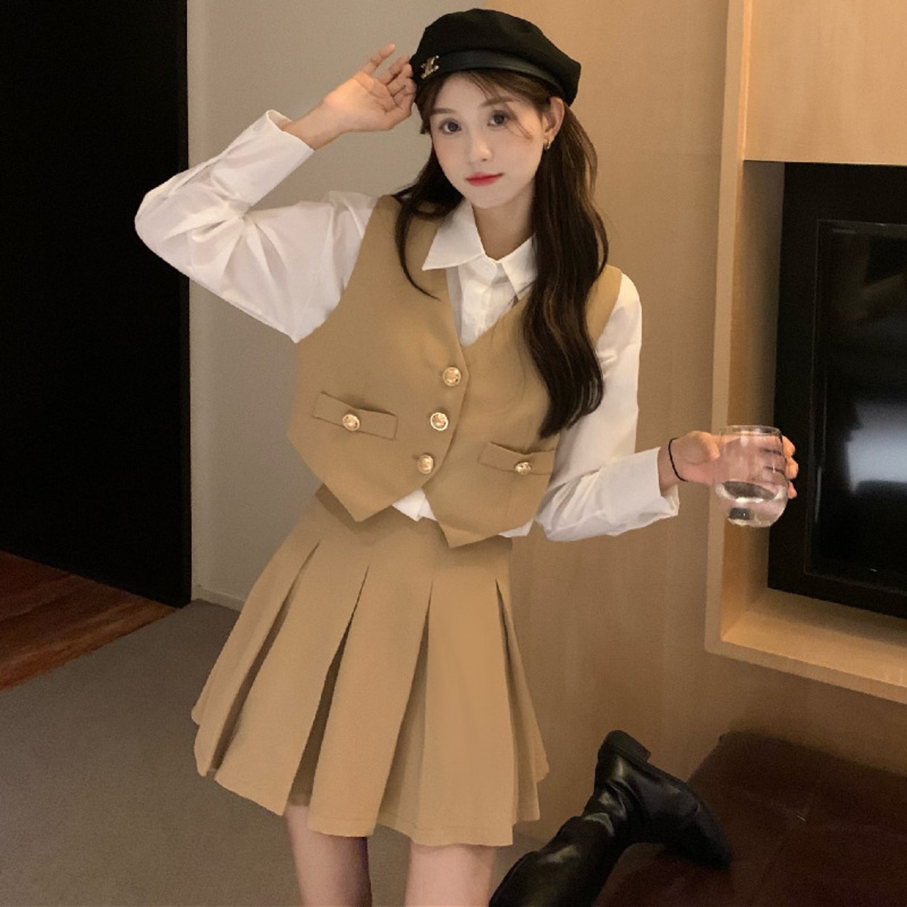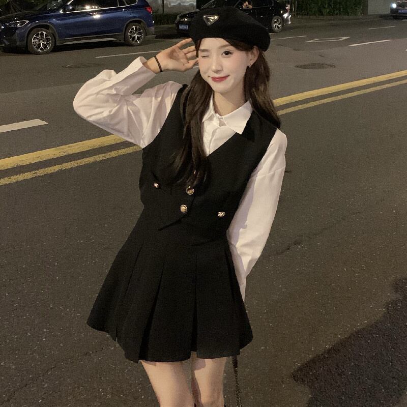 Milk sweet fashion suit skirt female spring 2022 new shirt vest pleated skirt small net red three-piece suit レッド 大人ガーリー スウィート キュート カジュアル プリーツ スプリング 春物 スカート s576151550293641