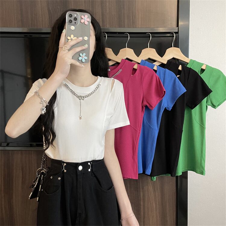 White short-sleeved T-shirt women's clothing design sense niche summer 2022 new slim fit, off-the-shoulder chic top clothes ホワイト サマー 夏物 スリム Tシャツ s576166644896883