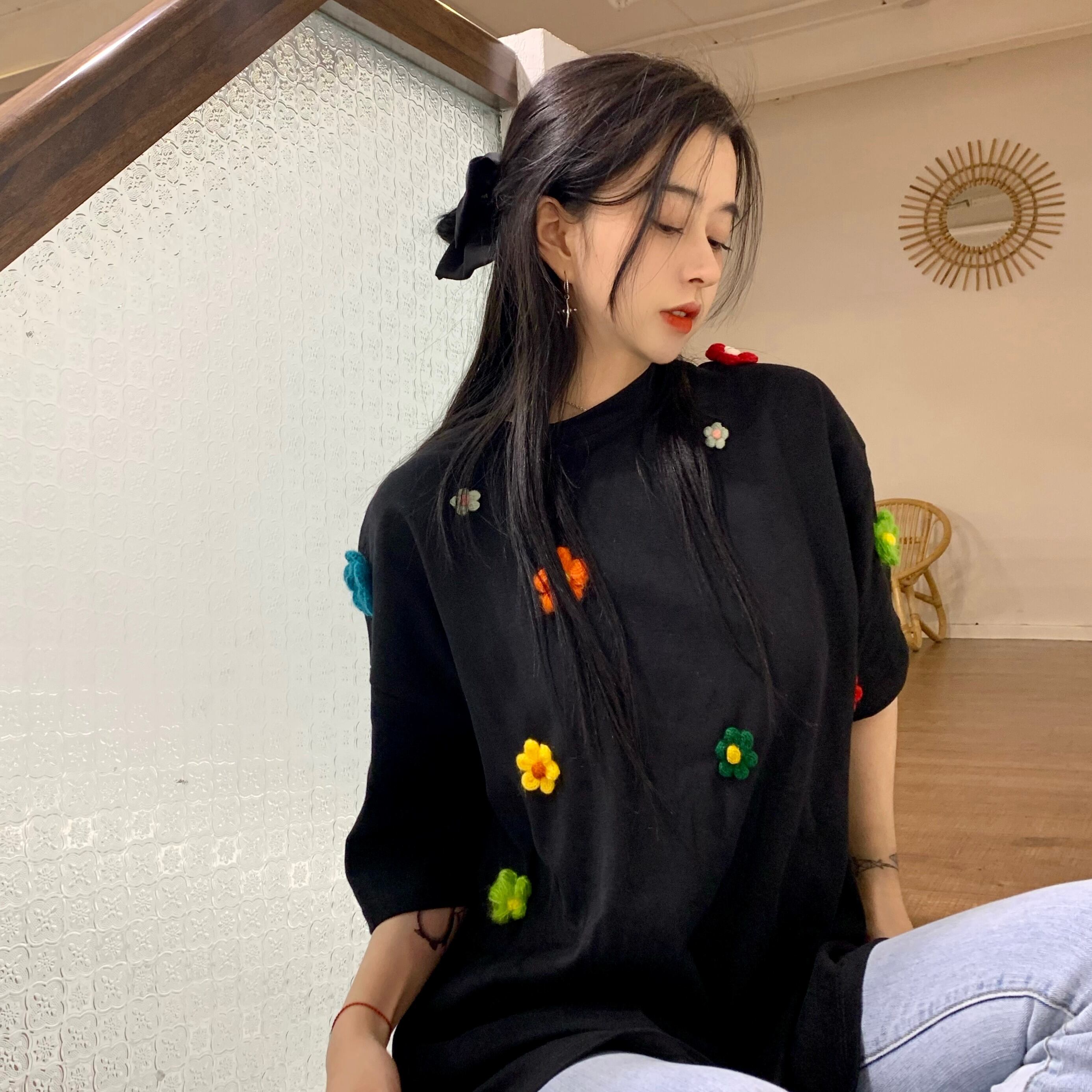 Black short-sleeved T-shirt women's clothing design sense niche 2022 new summer unique high-end flower top clothes ブラック サマー 夏物 Tシャツ フラワーデザイン s576160702056892